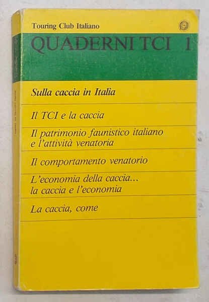 In 8° (cm. 23 x 14); pagg. 316; leggera carton. origin. VG. **"Quaderni TCI", 1. Contiene: il TCI e la caccia; il patrimonio faunistico italiano e l'attività venatoria; il comportamento venatorio; l'economia della caccia. la caccia e l'economia; la caccia, come.