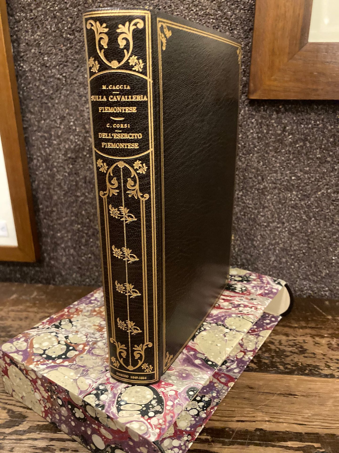 Due opere distinte legate in un unico tomo in-8° (24x16 cm) in elegante legatura novecentesca in piena pelle scura con titoli e ricchi fegi dorati al dorso, piatti e contropiatti riquadrati, rispettivamente, con filetti e fregi fitomofi dorati, sguardie carta marmorizzata, tagli dorati, custodia cartone rigido policromo (il tutto del legatore torinese Luciano Fagnola). Pp. (6) bianche, 163 (1); pp. (6), 289, (1), (6) bianche. Conservati di entrambe le opere i piatti delle brossure originali. Ottimi esemplari con alla prima opera invio autografo dell' autore al contropiatto anteriore. Interessante insieme formato da due rare edizioni di storia militare piemontese. Corsi fu maggiore d' artiglieria e professore emerito della Reegia Mlilitare Accademia Cfr. Manno-Promis I, 4090.