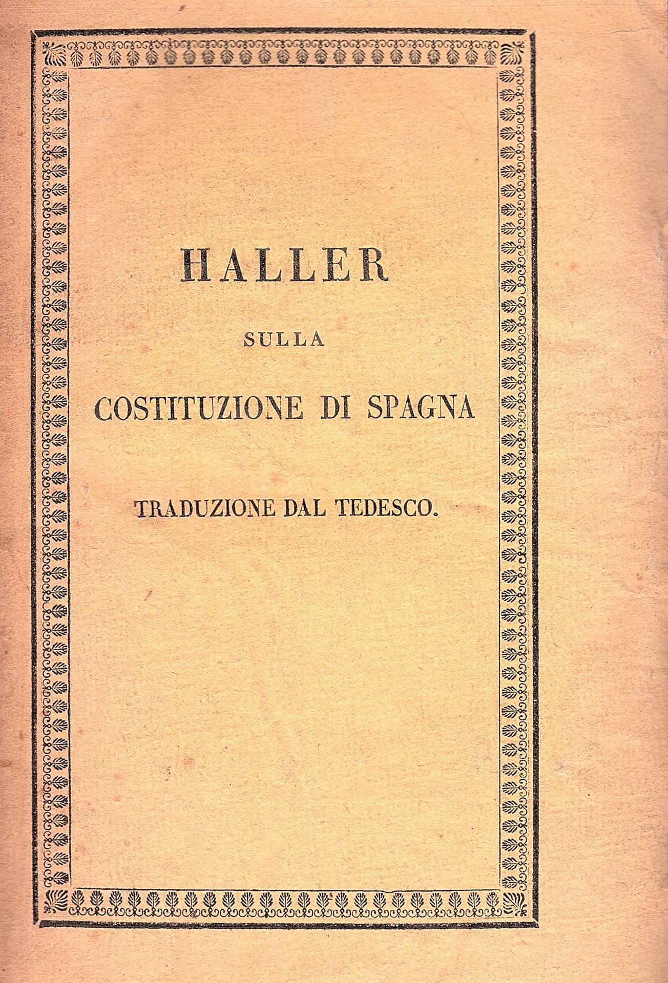 In-8° (22x14 cm), pp. (4) XV 16-135 (1), brossura editoriale gialla con titoli in nero entro cornice ai piatti. Leivi segni del tempo alla brossura (piccole mancanze al dorso), interno fresco. Più che buon esemplare in barbe. Ristampa torinese della prima edizione modenese coeva, di quest'opera del libellista svizzero scritta a Berna nel 1820, disamina della Costituzione spagnola del 1812, o Costituzione di Cadice, emanata dalle Cortes in opposizione all'occupazione napoleonica e al regime di Giuseppe Bonaparte. Tale carta costituzionalizzzo' la monarchia iberica, conferendole ordinamenti che avevano forti rassomiglianze con quelli assegnati nel 1791 alla monarchia francese e presentavano un carattere spiccatamente democratico che costitui' una valida ispirazione per successivi movimenti rivoluzionari e per progetti di consimili carte costituzionali. Karl Ludwig Von Haller (Berna, 1768-Soletta, 1854) fu grande storico e teorico politico della Restaurazione, famoso soprattutto per la 'Restauration der Staatswissenschaft' (1816-25), fortemente avversa ai principi ispiratori della Rivoluzione Francese.