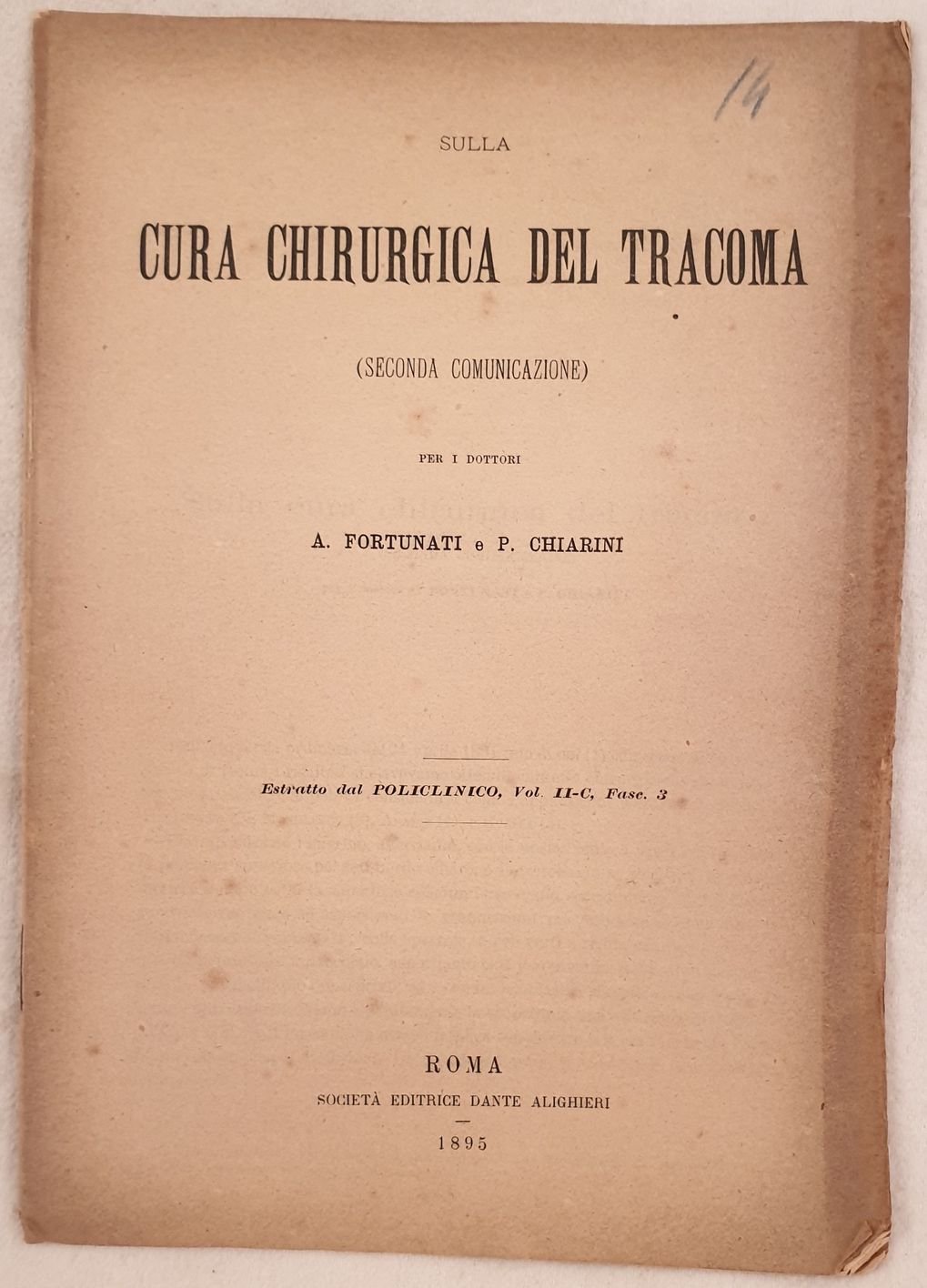 Edizione del 1895 di questa interessante pubblicazione di oculistica di Alfredo Fortunati. La pubblicazione analizza la cura chirurgica del tracoma. Estratto dal Policlinico vol. II-C Fasc. 3. In ottime condizioni. Copertina editoriale in buone condizioni generali con lievi usure ai margini e dorso. Legatura in ottime condizioni. All'interno le pagine si presentano in ottime condizioni con rare fioriture. In 8. Dim. 24x16,5 cm. Pp. 15. Edition of 1895 of this interesting pamphlet of oculistics by Alfredo Fortunati. Extract from Policlinico vol. II-C Fasc. 3. In very good conditions. Editorial cover in good general conditions slightly worn in the edges and spine. Binding in very good conditions. Inside pages are in very good conditions with occasional foxings. In 8. Dim. 24x16,5 cm. Pp. 15.