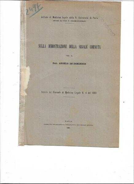 Istituto di Medicina legale della R. Università di Pavia.<BR>Estratto orig. dal Giornale di Medicina Legale N. 4 del 1901.<BR>8°, pp. 4. Br. edit. Dorso rinforzato. Timbretto privato. Un foro piccolissimo con minima perdita di testo interessa tutte le carte.
