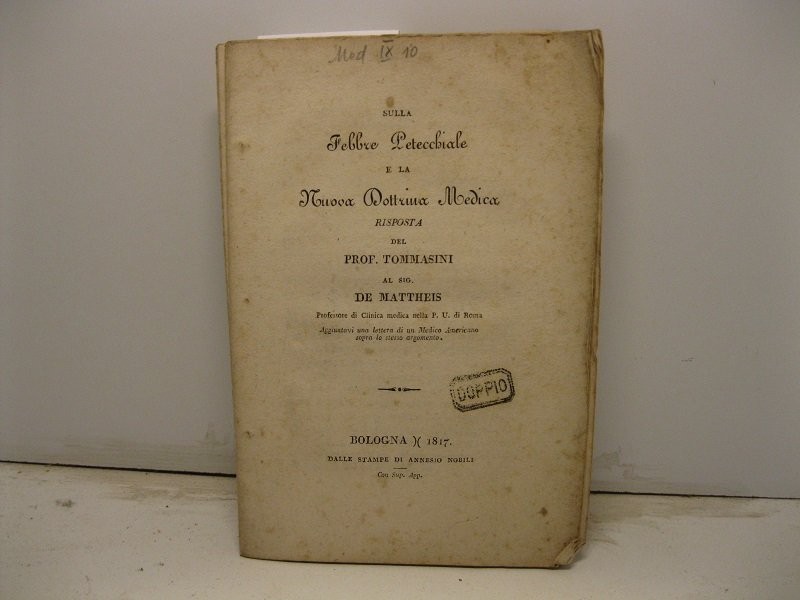 In 16, pp. 55 + (1). Br. rifatta. Studio relativo alla validita' del sistema del salasso nella cura della febbre petecchiale corroborato da alcuni esempi nel trattamento della malattia da parte di eminenti medici. Segue la 'Lettera del Dott. Belb Medico Americano all'Eccelmo. Sig. Prof. Tommasini'. Tommasini (1768-1846), originario di Parma, ricopri' la cattedra di Clinica Medica all'Universita' di Bologna. Sosteneva, nel sistema da lui proposto denominato 'Nuova Dottrina Medica Italiana', che l'infiammazione fosse il principio etiologico alla base di tutte le malattie.