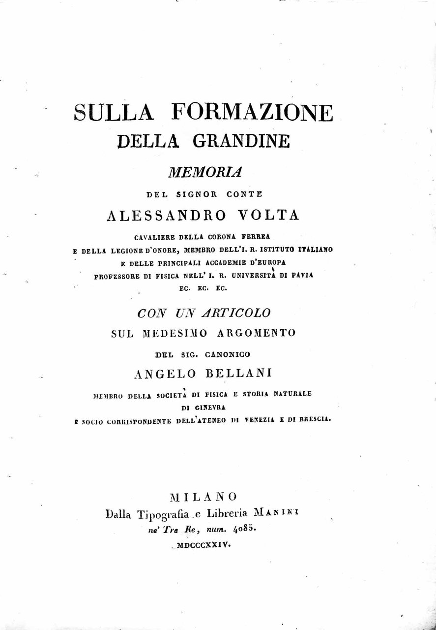 In-8 p. (mm. 225x140), brossura muta mod., pp. 170,(2). Questa interessante Memoria del Volta è così suddivisa: Sulla formazione della grandine - Sul periodo de' temporali e sul vento freddissimo ed istraordinariamente secco che si fa sentire molte ore dopo a quelli che scaricarono grandine. Riferisce il Manini nell'Avviso al lettore ..non essendo ancora stata finora inserita che in opere voluminose, ne restava riservata la lettura a pochi studiosi di uno dei principali fenomeni dell'elettricità atmosferica. Prescindendo dall'opinione recentemente divulgata da questo sommo maestro nell'elettrica scienza, l'origine da esso già assegnata alla formazione dei temporali grandinosi.. servirà a comprovare, che quanto può essere sicuro l'uso dei Parafulmini frankliniani per preservare le case, altrettanto inefficace deve riescire l'applicazione dei Paragrandini massime se di paglia alle campagne.Alla Memoria del Volta segue un lungo articolo del canonico Angelo Bellani, equivalente anch'esso ad un'altra Memoria sullo stesso argomento, che fu pubblicato per la prima volta sul Giornale di Fisica di Pavia nel 1817. "Prima edizione delle due Memorie riunite in un volume". Cfr. Scolari Alessandro Volta, n. 238 e 288.Dopo l'invenzione della pila l'attività di Volta si attenuò; tuttavia numerosi e ancora importanti sono i lavori da lui compiuti dopo il 1800; tra essi, una celebre Memoria sulla formazione della grandine. Così Diz. Treccani,XII, p. 858Lieve alone al marg. infer., altrimenti esemplare con barbe ben conservato.