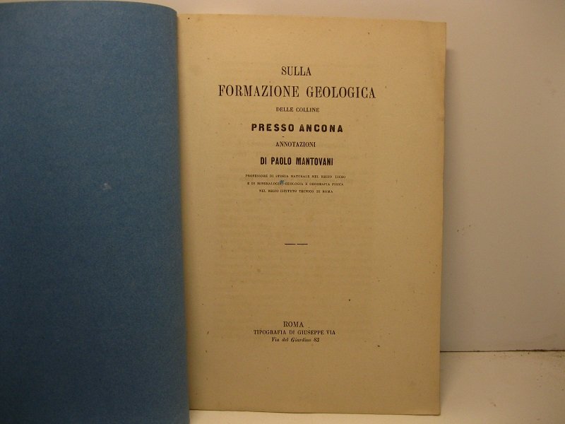 In 8, pp. 24 con 1 tav. in lit. f.t. Br. ed. muta. Studio relativo alle formazioni geologiche delle colline presso Ancona con catalogazione dei ritrovamenti fossili sulla Collina dei Cappuccini.