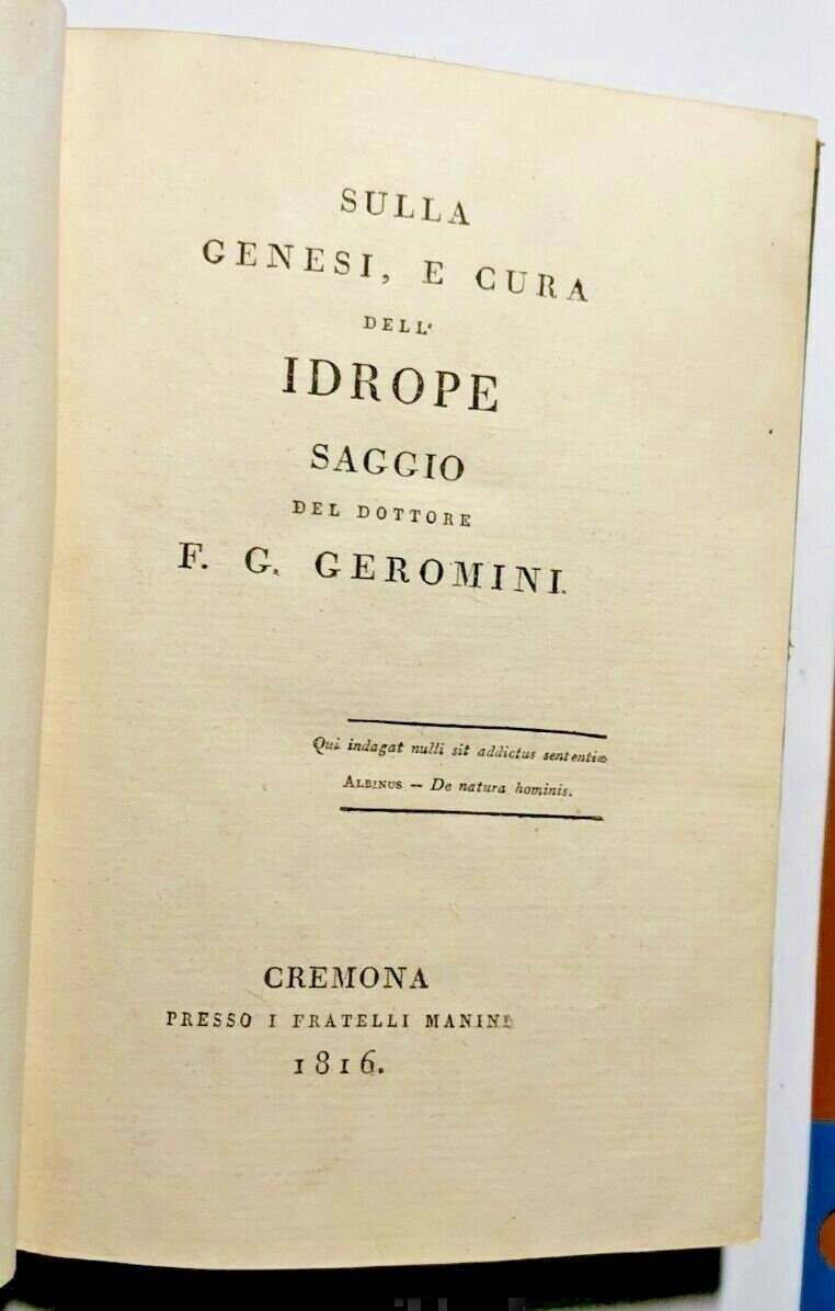 SULLA GENESI E CURA DELL'IDROPE saggio di Geromini 1816 libro antico medicina