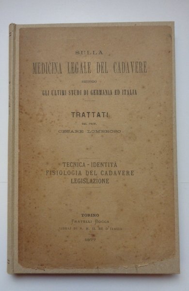 E.O. Un volume (14x21 cm) di 197-(2) pagine. Fioriture. Cartonato moderno con copertina della brossura originale applicata al piatto. Di grande rarità questo studio, scritto da Lombroso, su sollecitazione dei suoi colleghi dell'Università di Torino, per potergli conferire l'incarico di professore straordinario in quell'Ateneo (vedi Pierluigi Baima Bollone, Medicina Legale, ed. Giappichelli).
