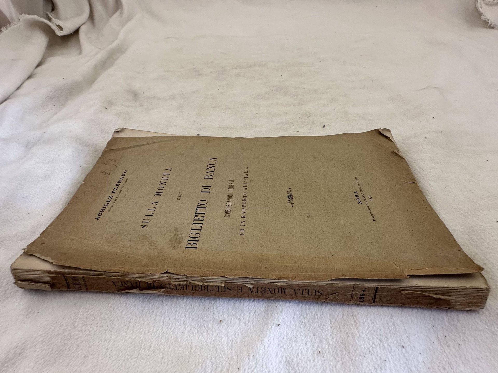 Edizione del 1884 di questa monografia sulla moneta e sul biglietto di banca scritto da Achille Plebano (1834-1905) giurista astigiano. In discrete condizioni. Copertina editoriale in discrete condizioni generali con lievi usure ai margini e dorso. Piatto anteriore staccato. Legatura in buone condizioni. All'interno le pagine si presentano in buone condizioni con rare fioriture. In 8. Dim. 25x16,5 cm. Pp. 255+(3).Edition of 1884 of this monography about coin and bank money written by Achille Plebano (1834-1905) jurist from Asti. In fair conditions. Editorial cover in fair general conditions lightly worn in the extremities. Front plate detached. Binding in good conditions. Inside pages are in good conditions with occasional foxing. In 8. Dim. 25x16,5 cm. Pp. 255+(3).