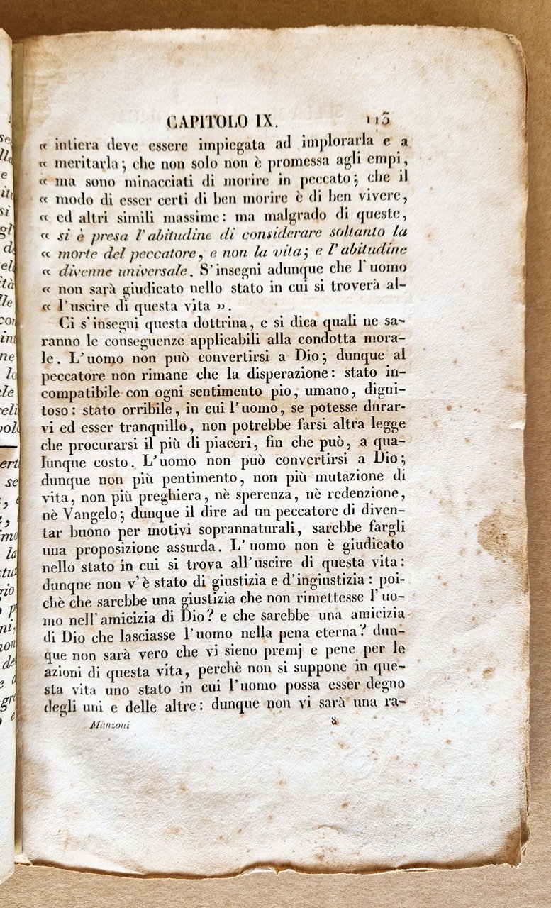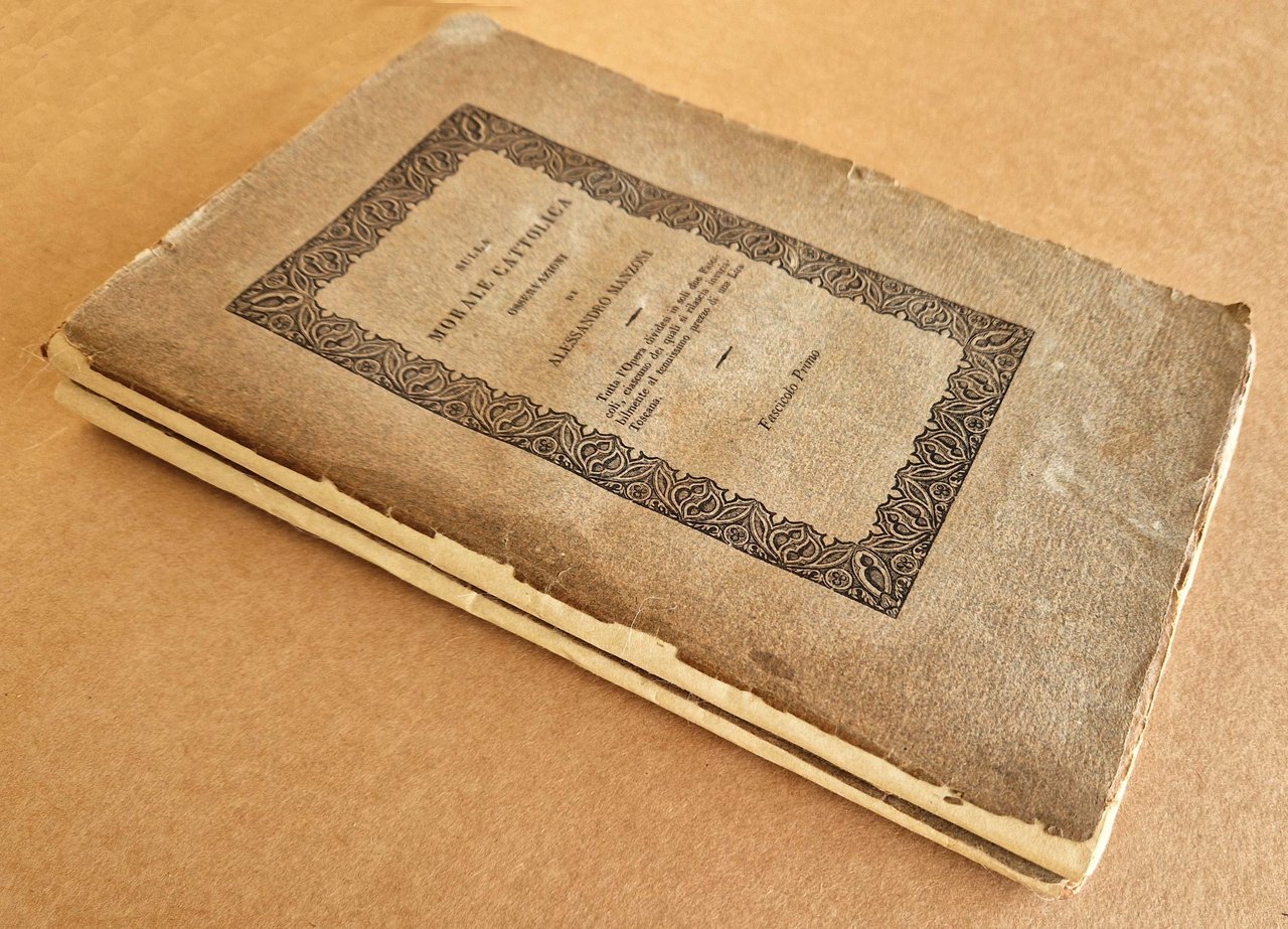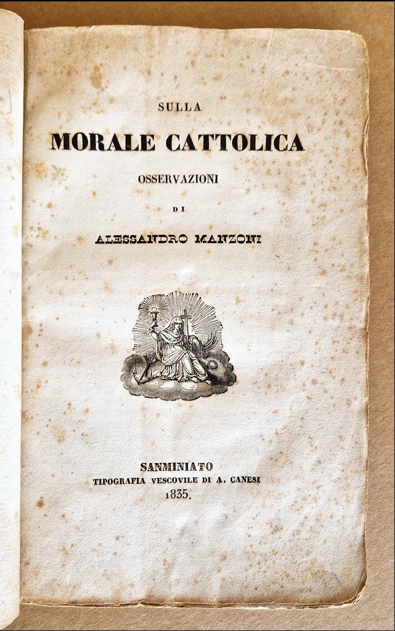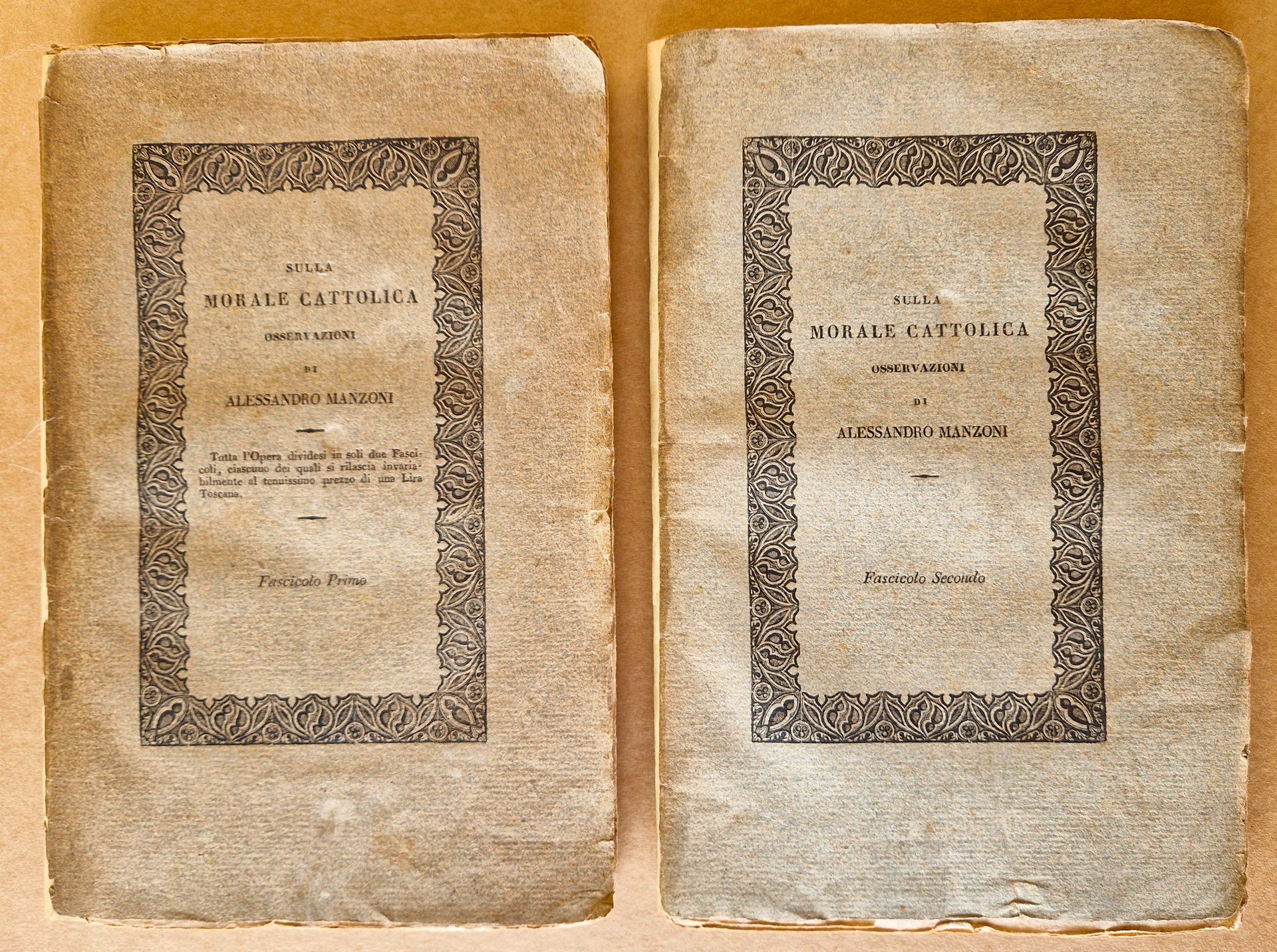 Opera in due volumi, dim. 234x150 mm, leg. in brossura editoriale, con titoli in nero all'interno di ricca cornice ai piatti anteriori; pp. XII, 112; 113-222. Rara edizione stampata a San Miniato di questa celebre opera manzoniana di etica cattolica, pubblicata originariamente nel 1819. Rif.: IT\ICCU\RAV\1498031 e IT\ICCU\RAV\1498032. Cond.: Tracce d'uso alla legatura (bruniture, pieghe e piccoli strappi marginali). Carte in barbe, con notevole presenza di fioriture. Esemplare nel complesso accettabile.