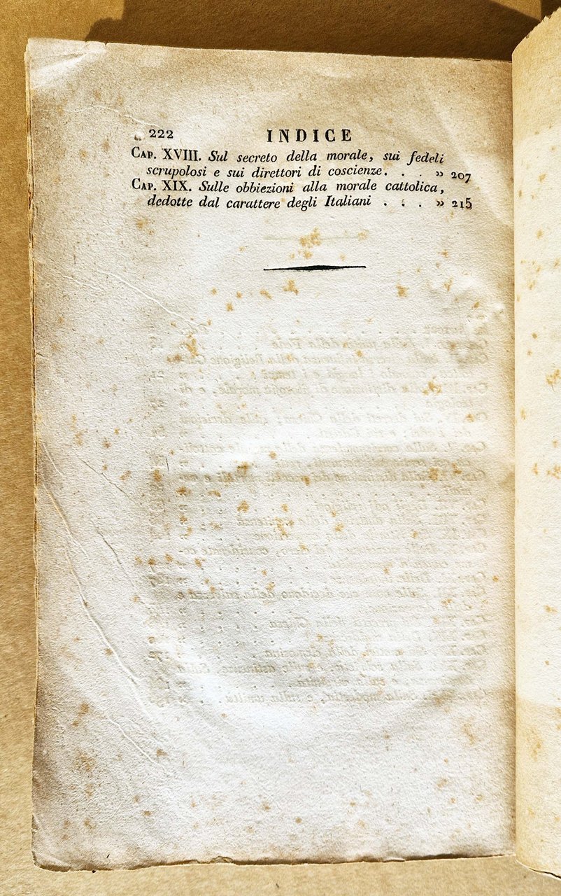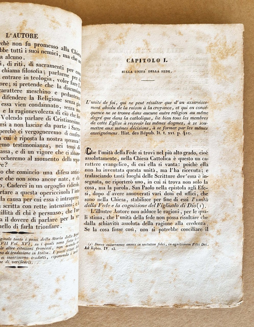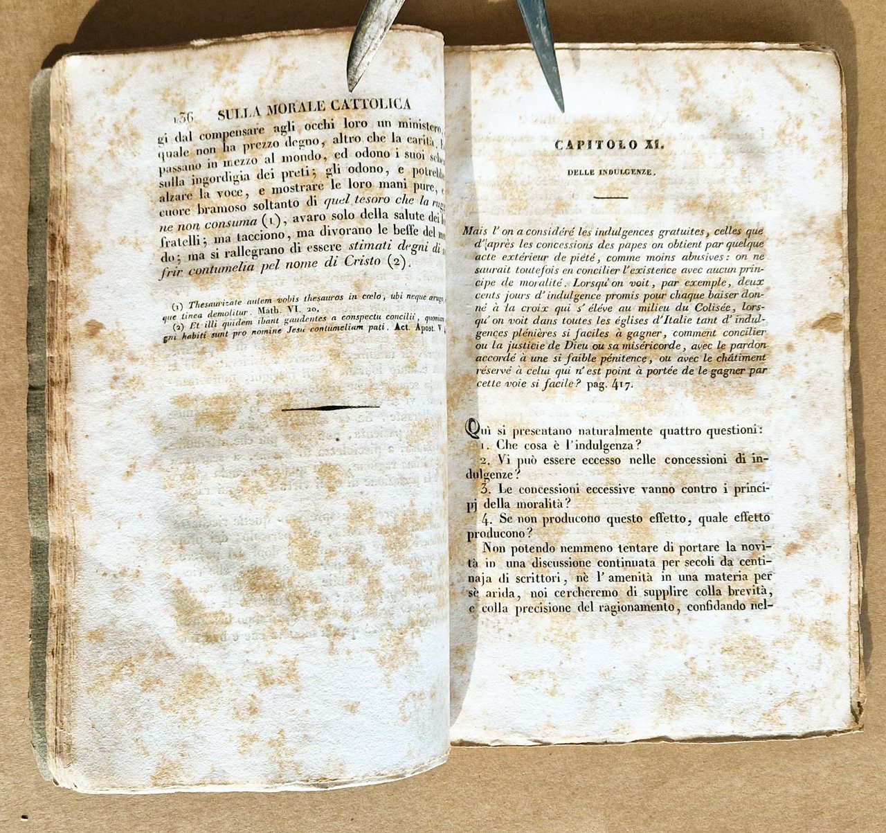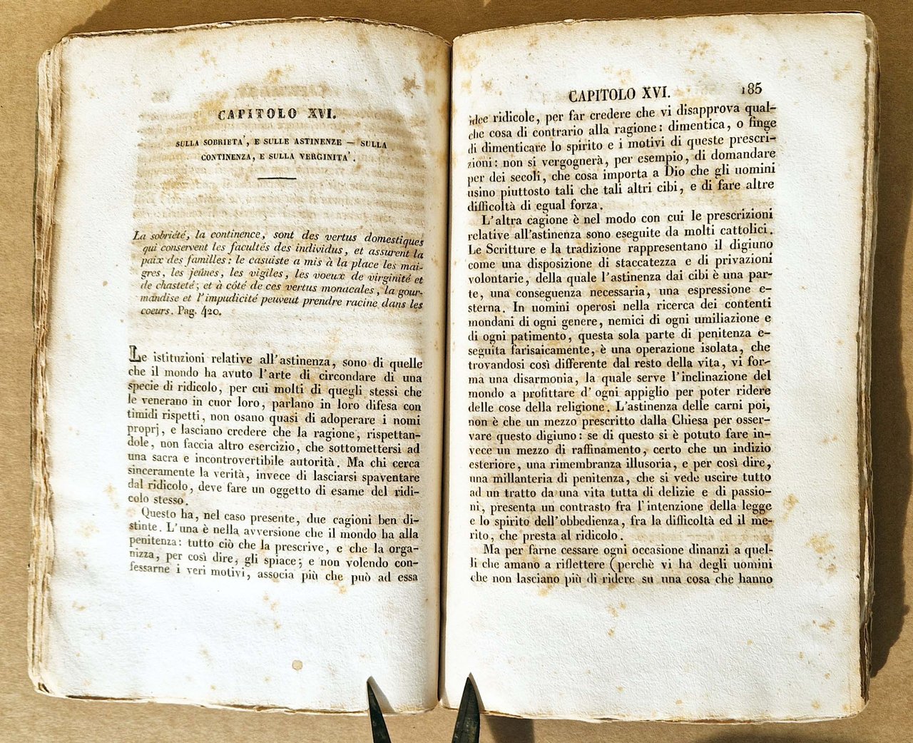 Opera in due volumi, dim. 234x150 mm, leg. in brossura editoriale, con titoli in nero all'interno di ricca cornice ai piatti anteriori; pp. XII, 112; 113-222. Rara edizione stampata a San Miniato di questa celebre opera manzoniana di etica cattolica, pubblicata originariamente nel 1819. Rif.: IT\ICCU\RAV\1498031 e IT\ICCU\RAV\1498032. Cond.: Tracce d'uso alla legatura (bruniture, pieghe e piccoli strappi marginali). Carte in barbe, con notevole presenza di fioriture. Esemplare nel complesso accettabile.