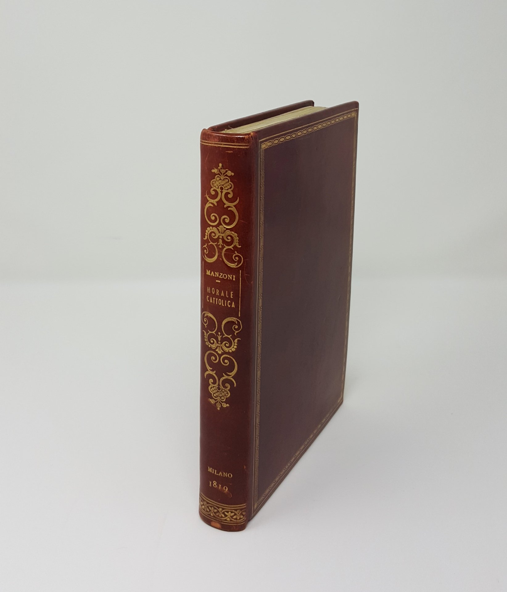>in-8 pp. 4 n.n. XIII,1, 297, 5 n.n. Brochure originale muta in carta rosa entro legatura posteriore in stile ottocentesco, in piena pelle titoli e fregi oro al dorso, bordura ai piatti. Qualche pagina ingiallita, uno strappo restaurato alla p.139/140 con perdita di una riga di testo. Un tassello cartaceo all'ultima pagina riporta l'errata. L'editore Lamperti diede alle stampe quest'opera con l'intenzione di pubblicare anche la seconda parte. Manzoni non arrivò a dare a questa la necessaria sistemazione, pur avendo sottoposto, nel 1825 una copia autografa, al giudizio dell'abate Gaetano Giudici. Quest'ultimo curò più tardi la diffusione del testo in copie manoscritte ma la stampa vide la luce solo nel '900. Buon esemplare, poche lievi e marginali fioriture, nota di possesso ms. al contropiatto anteriore della brochure: "De la bibliothque de ... Bertheley". Vismara 242. Parenti, Rarità I, p. 168. Manca a Salveraglio.