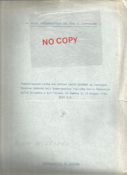 PP. 7, CM. 31,5X24, BROSS., ALLEGATA LETTERA INDIRIZZATA ALL'AUTORE DAL CONSORZIO NAZIONALE PRODOTTI ZUCCHERO INERENTE ALLA BOZZA.<BR>COMUNICAZIONE LETTA DAL DOTTOR CARLO BIGNAMI AL CONVEGNO TECNICO INDETTO DALL'ASSOCIAZIONE ITALIANA DELLE INDUSTRIE DELLO ZUCCHERO E DELL'ALCOOL IN PADOVA IL 17 GIUGNO 1934 XII° E.F.