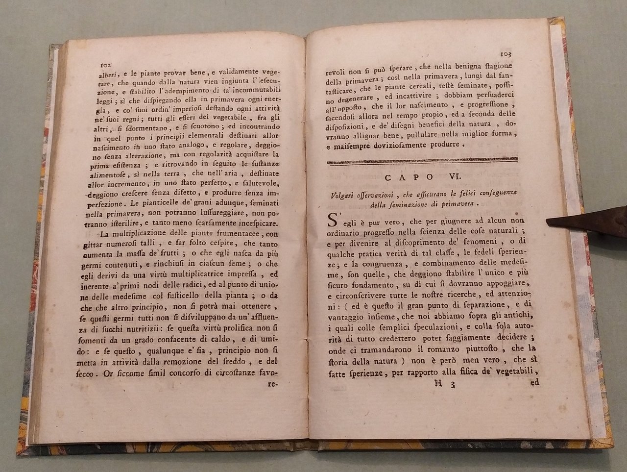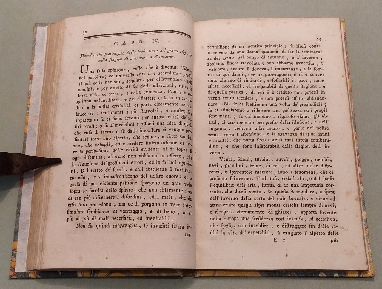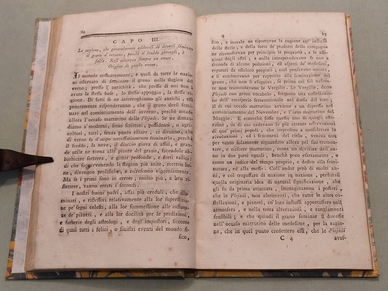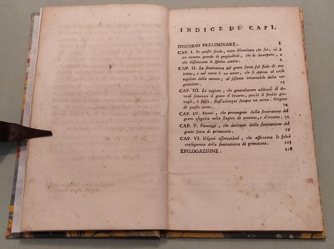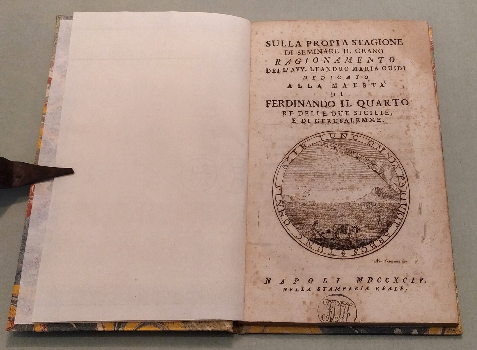 Napoli, nella Stamperia Reale, 1794. In 16mo; cc.4n.nn.; pp.XIV, 121. Vignetta incisa in rame al frontespizio con il Vesuvio, un aratro e le costellazioni. Timbro di biblioteca estinta. Cart. posteriore. L'autore ritiene essere errata la credenza di doversi seminare il grano di autunno o d'inverno e spiega i vantaggi della semina in primavera. Inoltre sostiene che "in questo secolo, tutto illuminato che sia, vi à un numero grande di pregiudizi, che lo deturpano e che dissonorano lo Spirito umano". Edizione originale. Niccoli, pag. 196.