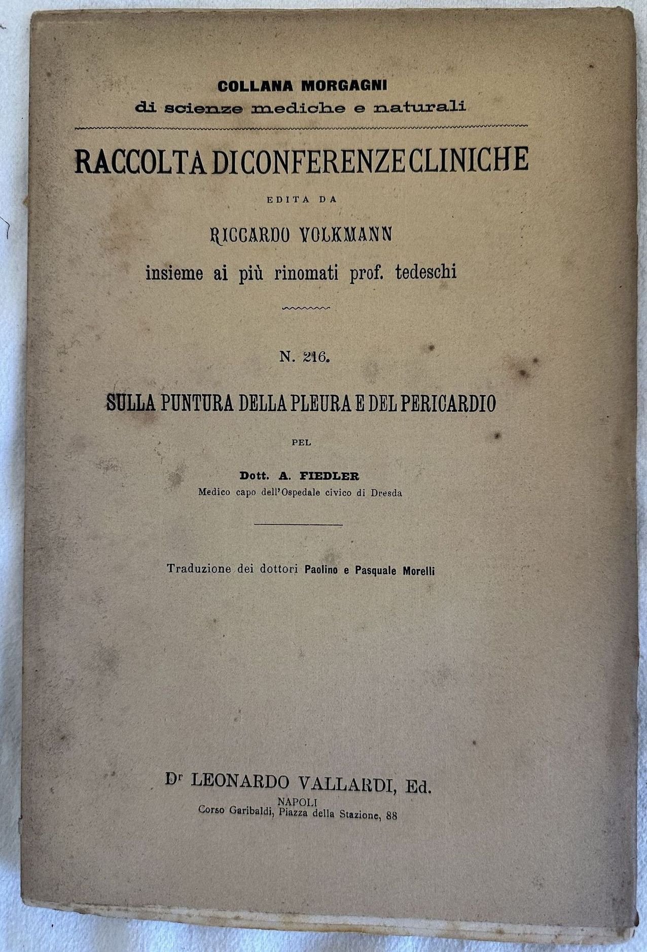 Interessante pubblicazione del 1880 circa sulla puntura della pleura e del pericardio del Dott. A. Fiedler. Fascicolo della Collana Morgagni di scienze mediche e naturali n. 216. In ottime condizioni. Copertina editoriale in ottime condizioni generali con lievi usure ai margini e dorso. Legatura in buone condizioni. Pagine in ottime condizioni con rare fioriture. Intonso. In 8. cm. 25x16,5. Pp. 2479-2512.Interesting pamphlet of 1880 circa about pleura and pericardio by Dott. A. Fiedler. Pamphlet of Collana Morgagni of natural and medical science n. 216. In very good conditions. Editorial cover in very good conditions lightly worn in the extremities. Binding in good conditions. Pages in very good conditions with occasional foxing. In 8. cm. 25x16,5. Pp. 2479-2512.