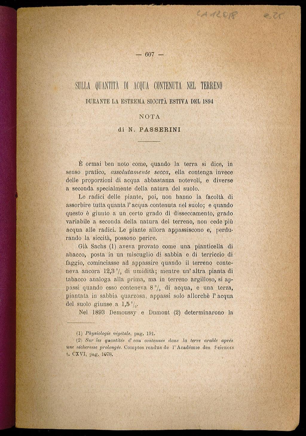 Sulla quantità di acqua contenuta nel terreno durante la estrema siccità estiva del 1894