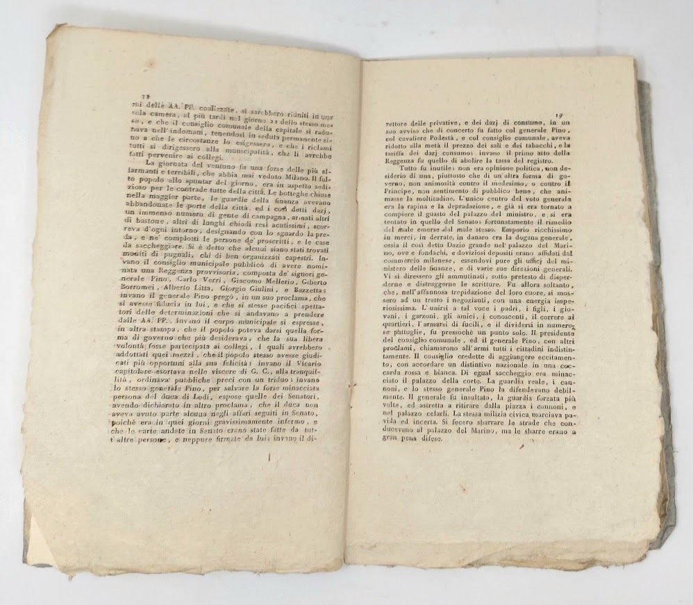 >in-8 (210x130 mm), pp. 57, (1 bianca), brossura in carta muta coeva. Perfetto esemplare, in barbe. Prima edizione. Il Conte Armaroli (Macerata, 1766 – Appignano, 1843) fu avvocato e politico italiano convintamente filo-napoleonico, che si contrappose al programma indipendentistico sostenuto da Federico Confalonieri, anche con la presente opera sulla Rivoluzione di Milano. "Contiene la cronaca degli avvenimenti, dalla seduta straordinaria del senato del 17 aprile alle manovre del Melzi per far accettare Eugenio come re indipendente, al moto provocato dagli "Italici" e culminato con l'uccisione del ministro Prina, al tramonto delle speranze riposte nell'Inghilterra, all'annessione della Lombardia da parte dell'Austria. La Memoria ebbe subito grande diffusione, nonostante la sorveglianza della polizia austriaca; tra le reazioni dei personaggi più direttamente colpiti, più importanti furono quelle del generale Domenico Pino con le Osservazioni sopra alcune asserzioni dell'autore dell'opuscolo che ha per titolo "Su la Rivoluzione di Milano..."(Italia 1815), e di Confalonieri che con la Lettera ad un amico del 15 marzo 1815 ribadì la validità della posizione assunta l'anno precedente e rigettò l'asserzione che egli avesse condotto il popolo all'assalto del Senato (cfr. G. Casati, Memorie e Lettere di Federico Confalonieri, I,Milano 1890, pp. 253-273)" (vedi: Dizionario Biogr.). Ottimo esemplare, in barbe. Parenti, Dizionario dei luoghi di stampa falsi, p. 163. Dizionario Biografico degli Italiani - Volume 4 (1962)