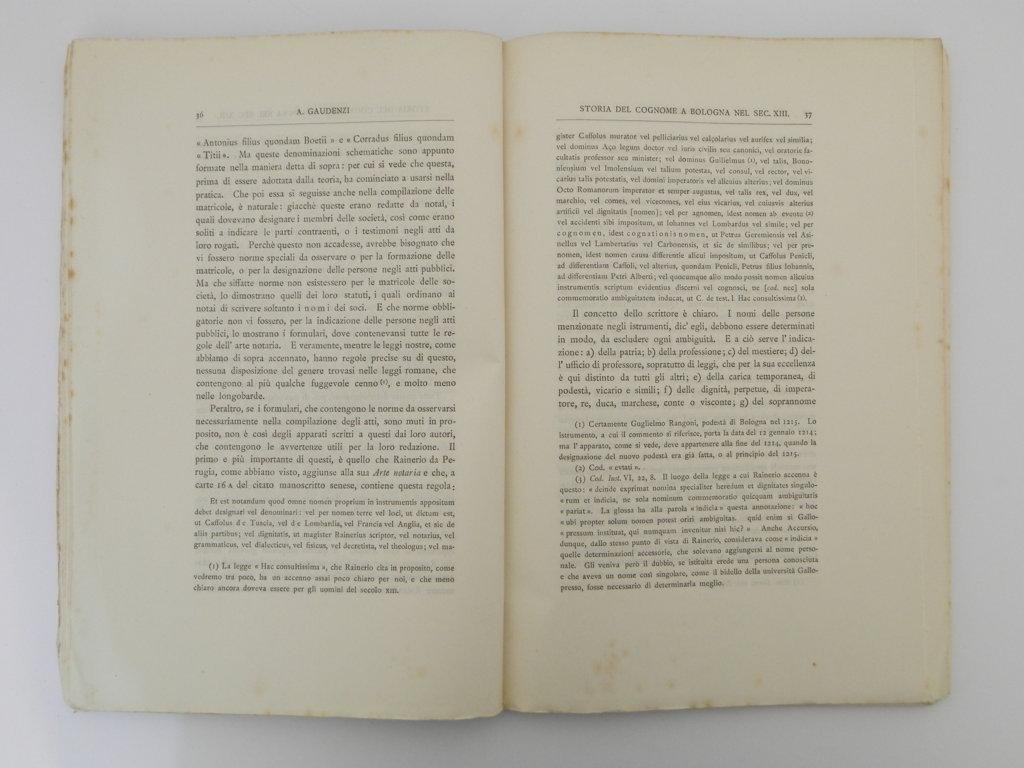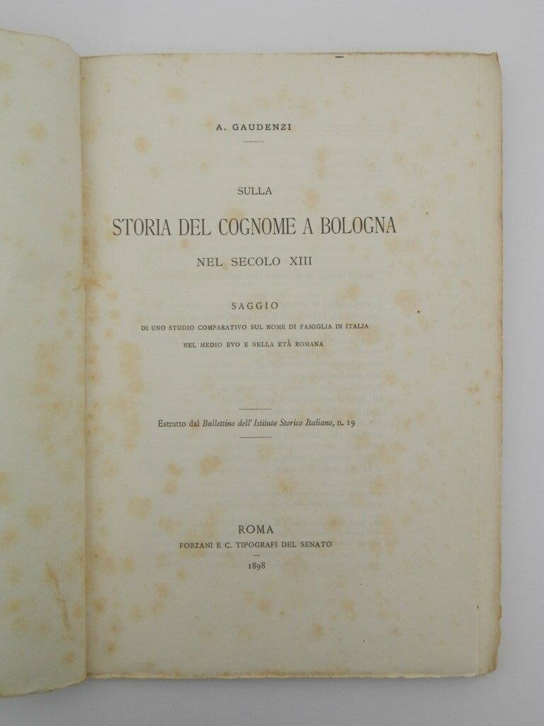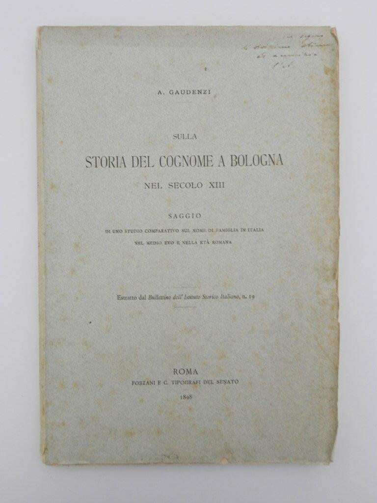 Sulla storia del cognome a Bologna nel secolo XIII. Saggio di uno studio comparativo sul nome di famiglia in Italia nel medio evo e nella età romana
