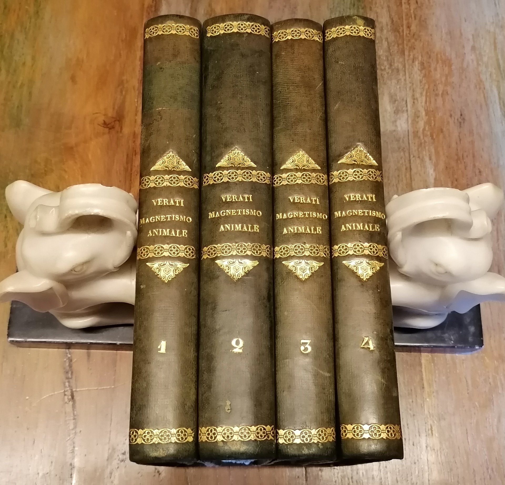 (Magnetismo; Mesmerismo; Fenomenologia magnetica; Spiritismo - Ipnotismo; Sonnambulismo magnetico) Quattro volumi in 8°, legatura coeva in mezza pelle verde con titoli, filetti ornati e fregi impressi in oro al dorso, carta marmorizzata ai piatti, pp. 522,(2) ; 591.(1) ; 466,(2) ; (4),425,(1). Prima edizione. Ottimo stato di conservazione.