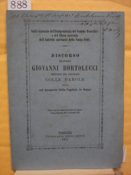 SULLE GARANZIE DELL'INDIPENDENZA DEL SOMMO PONTEFICE E DEL LIBERO ESERCIZIO DELL'AUTORITA' SPIRITUALE DELLA SANTA SEDE. DISCORSO DELL'AVVOCATO GIOVANNI BORTOLUCCI DEPUTATO DEL FRIGNANO COLLE PAROLE DETTE SUL TRASPORTO DELLA CAPITALE IN ROMA.