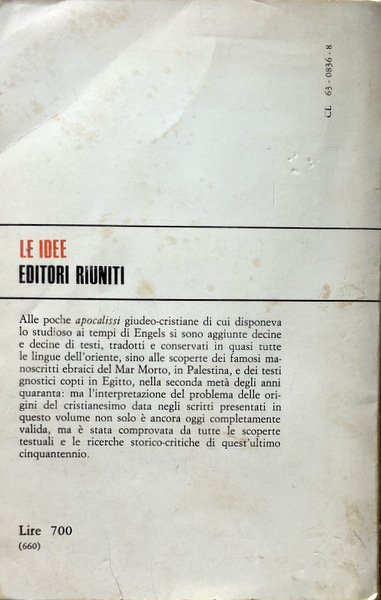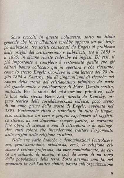 Alle poche apocalissi giudeo-cristiane di cui disponeva lo studioso ai tempi di Engels si sono aggiunte decine e decine di testi, tradotti e conservati in quasi tutte le lingue dell'oriente, sino alle scoperte dei famosi manoscritti ebraici del Mar Morto, in Palestina, e dei testi gnostici copti in Egitto, nella seconda metà degli anni quaranta: ma l'interpretazione del problema delle origini del cristianesimo data negli scritti presentati in questo volume non solo è ancora oggi completamente valida, ma è stata comprovata da tutte le scoperte testuali e le ricerche storico-critiche di quest'ultimo cinquantennio.