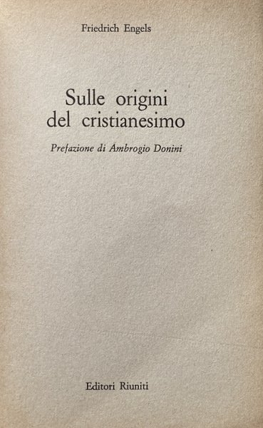 «La religione cristiana è nata nella piena luce della storia e non vi è nulla, nelle sue origini e nel suo sviluppo, che non possa essere spiegato. Si tratta soprattutto di vedere, come ci insegna Engels in questi suoi scritti, non già se il tale o il talaltro episodio, quale ci viene riferito nei libri mitologici del Nuovo Testamento, o nella primitiva letteratura cristiana, si sia realmente verificato, ma a quale bisogno rispondesse questa o quella determinata credenza religiosa delle masse»: così scrive lo storico delle religioni Ambrogio Donini nella prefazione a questo volume che raccoglie tre scritti di Engels sulla questione delle origini del cristianesimo, pubblicati in riviste tedesche e inglesi tra il 1863 e il 1895.