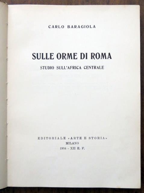 Editoriale “Arte e Storia”, Milano, 1934 – XII E. F. In 8vo, pp. 176 (con Indice), ill. fot. virate al marrone n. t., leg. in t. pelle liscia verde, titolo oro al dorso e filetti oro ai piatti. Di questo volume sono stampate le seguenti edizioni: Edizione straordinaria. Cinquanta esemplari numerati con numeri romani dall'Uno al Cinquanta e rilegati in pelle. Fuori commercio. Edizione rara: Duecento esemplari, numerati con cifre arabe dall'Uno al Duecento. Edizione comune. (Nel formato 16 x 22) impressione in rotocalco. Questo è esemplare N. 31 di edizione rara. Importante e validissima pubblicazione per la comprensione del continente africano in ogni suo aspetto e delle intenzioni dell'approccio coloniale italiano. Il volume si suddivide in tre conferenze, che formano un trittico che esprime l'essenziale riassunto della più recente ed aggiornata esperienza africana di Carlo Baragiola (dalla sua Prefazione). Abrasioni marginali alla legatura, specie a punte e dorso, peraltro molto piacevole da maneggiare, conservazione molto buona.