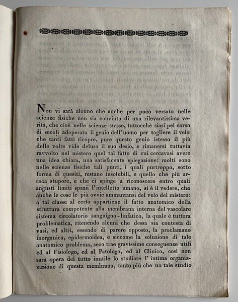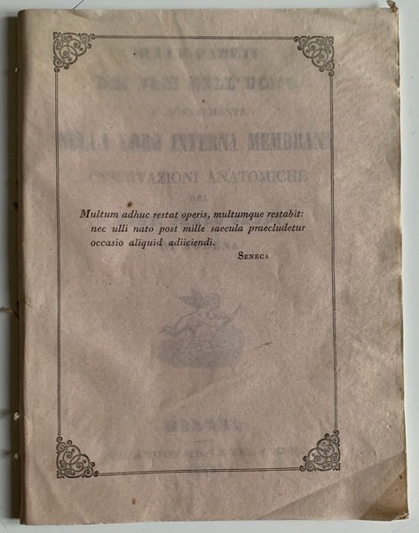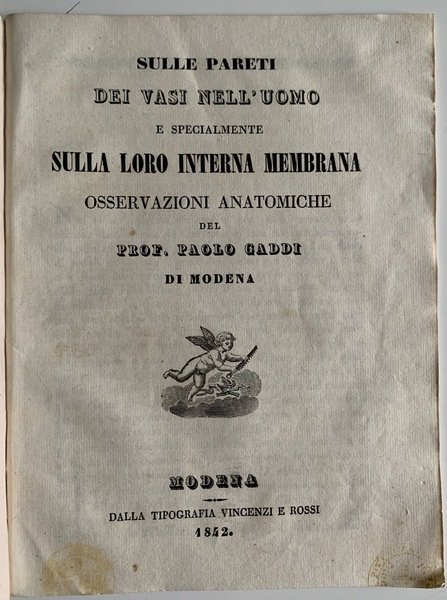 In 4° (22,3x17 cm); 33, (3) pp. Mantenuta la brossura anteriore con passo di Seneca entro cornice xilografica (manca il piatto posteriore). Timbro del censore estense al margine basso del frontespizio e dellultima carta. Buone-ottime condizioni di conservaizone. Piccola xilografia al frontespizio. Seconda edizione, ma considerata prima in quanto aumentata di 20 pagine rispetto alla prima del 1840, di questo importante scritto di Fisiologia del grande anatomista modenese Paolo Gaddi (Modena 1806 - ivi 1871) autore di diversi importantissimi studi di anatomia, teratologia, antropologia, istologia, ostetricia storia della medicina ma anche botanica e storia naturale. Fu a lungo medico condotto di Modena dove ebbe anche la carica di settore del gabinetto anatomico a partire dal 1837. Nel 1841 successe a Gentili nella carica di direttore del gabinetto anatomico e alla carica di professore ordinario di anatomia (poi denominata dallo stesso anatomia umana). Nel 1864 divenne preside della Facoltà di Medicina e Chirurgia di Modena. Per suo merito l'Università di Modena, poté dotarsi di un grande museo etnografico-antropologico scientificamente ordinato, nonostante lo scarso investimento di soldi che la stessa università mise a disposizione, che fu la prima struttura universitaria del genere, ammirata e lodata anche da R. Virchow. Interessato nella teratologia fu tra i primi ad individuare una relazione fra ambiente dove veniva portata avanti la gravidanza e la nascita di malformazioni. Si occupò anche di evoluzionismo. Fu anche tra il gruppo di esperti al quale fu affidato lo studio del cranio di Dante rinvenuto a Ravenna nel 1865. Fu anche fra i primi a proporre luso di narcotici sugli animali utilizzati negli esperimenti per alleviare le loro sofferenze. Fu anche figura di spicco dellAccademia di Scienze, Lettere ed Arti di Modena. Questo qui presentato è un suo celebre studio sulle arterie e vene e sulla loro membrana. Prima rara edizione in buone-ottime condizioni di conservazione.