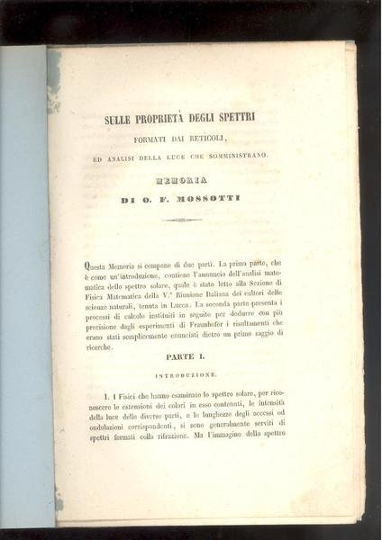 SULLE PROPRIETA DEGLI SPETTRI. FORMATO DEI RETICOLI, ED ANALISI DELLA LUCE CHE SOMMINISTRANO. MEMORIA DI O. F. MOSSOTTI