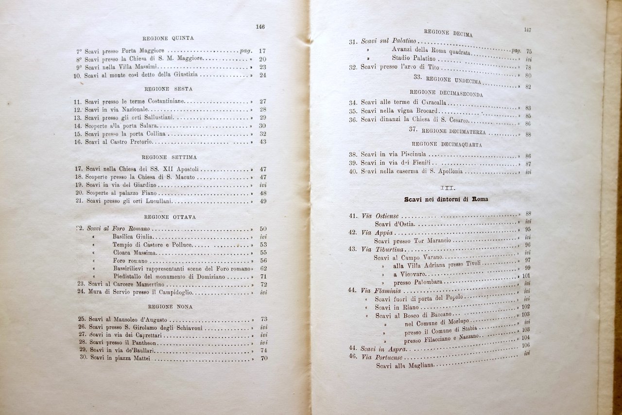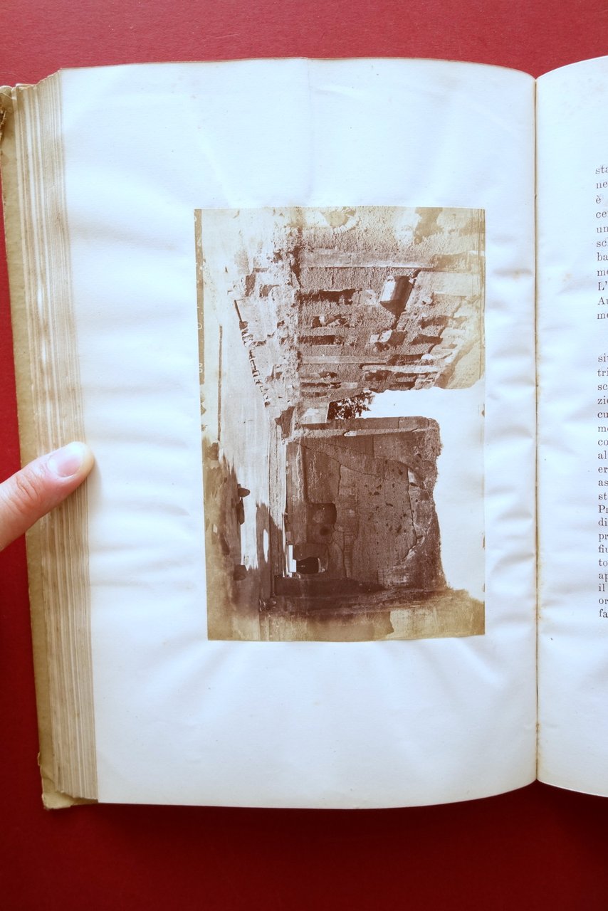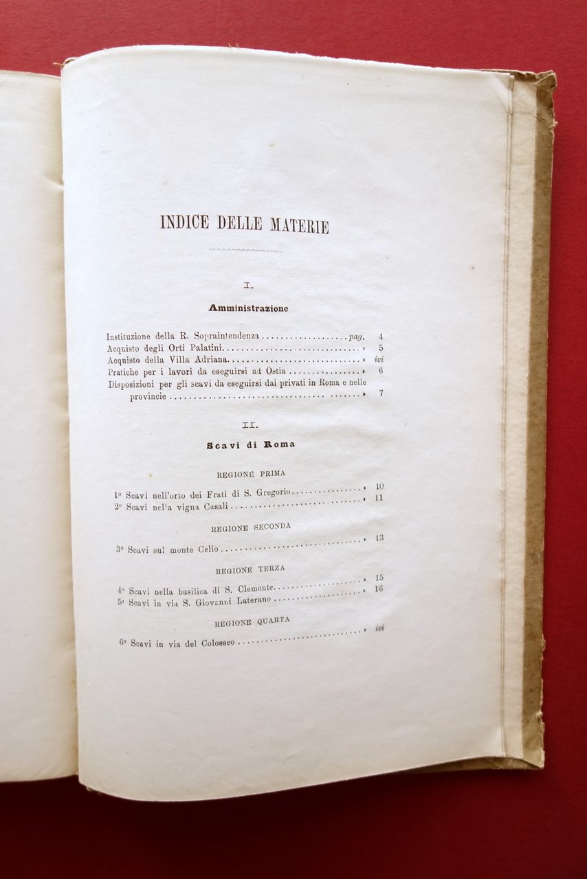 † Sulle Scoperte Archeologiche della citt‡ e provincia di Roma negli anni 1871-72 relazione presentata a S. E. il Ministero di Pubblica Istruzione dalla R. Soprintendenza degli Scavi della Provincia di Roma Regia Tipografia, Roma 1873; cm 27x18,5; pp. 148 pi˘ 36 belle ill. fotografiche originali applicate fuori t., raffiguranti varie fasi degli scavi archeologici (vedi foto); tutto cartonato ed. con titolo al piatto ant. Contropiatto e piatto ant. con, rispettivamente, firma dell'ex proprietario e sigla A.R." † Condizioni di conservazione Esemplare in buone condizioni con tracce d'uso, coperta leggermente ingiallita con qualche piccola macchietta e leggere ombre di gore di vecchia umidit‡ che non interessano le pagine; angoli dei piatti con piccole mancanze; dorso con alcune piccole leggere abrasioni e una piccola mancanza alla cuffia sup. Interni buoni con alcune piccole leggere bruniture. † Opera molto rara sugli scavi archeologici romani di fine Ottocento, corredata da 36 belle fotografie originali applicate a piena pagina degli scavi. Per maggiori informazioni vedi foto indice. † SETT213.L19989 N "