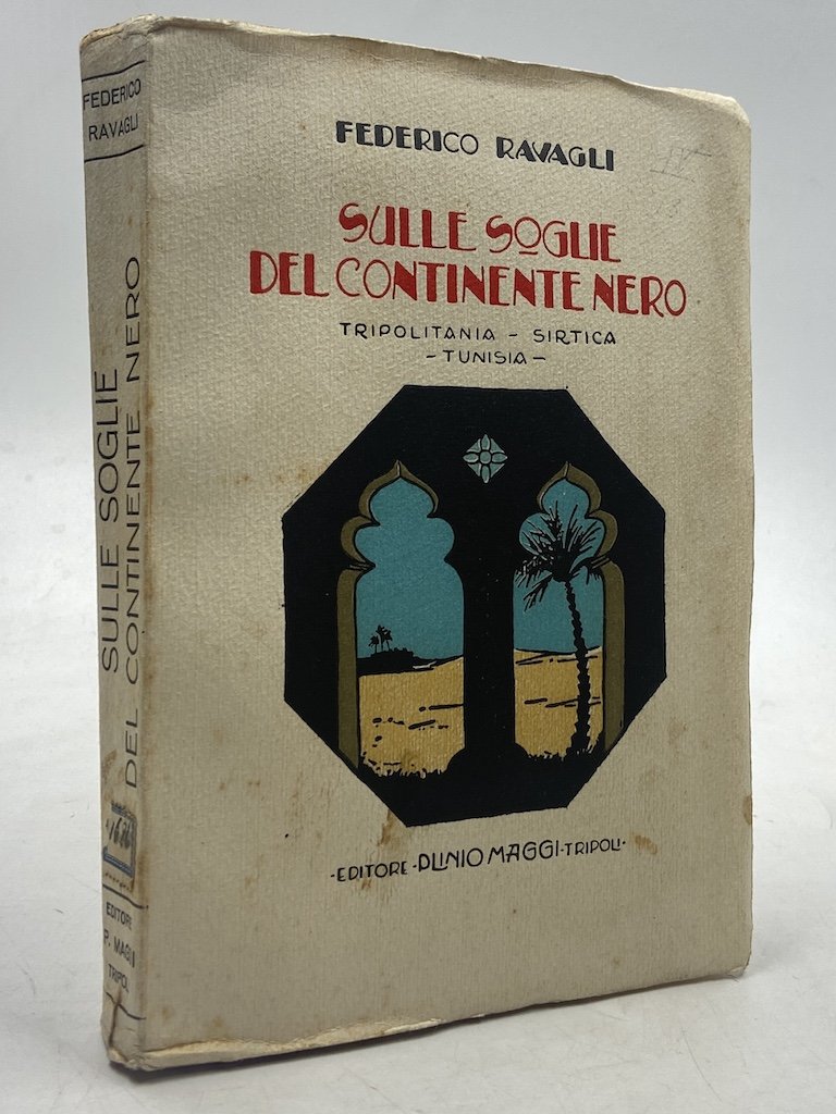 Brossura editoriale illustrata, cm14x19, pp XXVIII 247 (5), 72 fotografie in nero fuori testo su carta patinata, una carta geografica ripiegata. Edizione originale, stampata a “Tripoli d’Africa”, con Lettera-prefazione di Arnaldo Mussolini. Esemplare arricchito d’un invio autografo dell’autore. Ravagli, giornalista e scrittore nonché studioso del folklore romagnolo, raccolse queste impressioni africane negli anni in cui insegnò al Liceo Italiano di Tripoli. Il volume tratta diffusamente della Fiera di Tripoli, di viaggi alle gole di Tarhuna, a Garian, Misurata, Hon, la Sirte e mostre altre località; inoltre nei capitoli dedicati alla Tunisia molte notizie sulle comunità italiane locali.