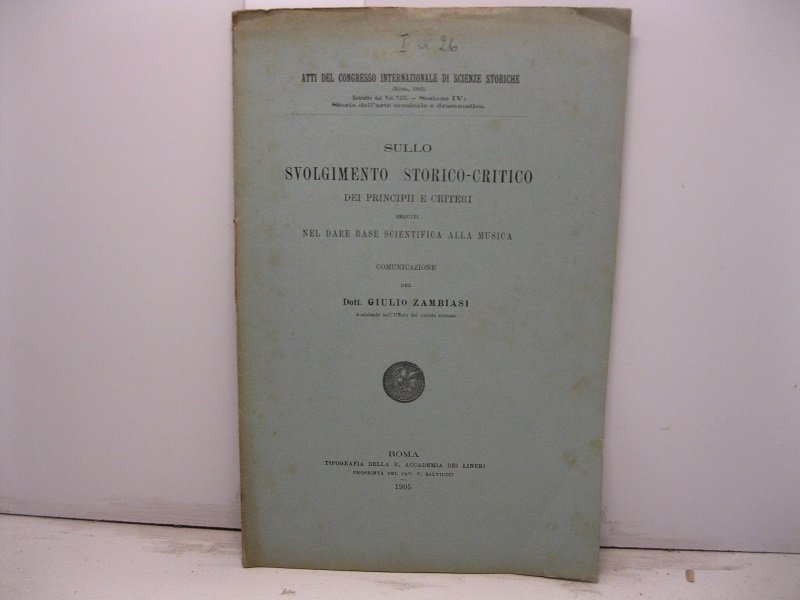 In 8, pp. 18 + (2b) con ill. n.t. Br. ed. Dall'introd.: 'Scopo della presente comunicazione e' di mostrare, come dalla considerazione dello sviluppo storico della teoria dell'arte musicale, si possa ricavare un giusto criterio per una concezione scientifica dell'arte stessa.'.