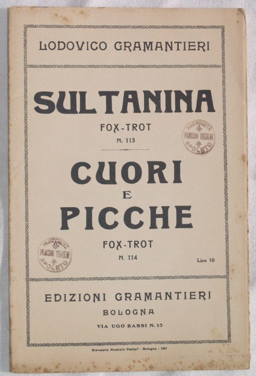 In 8. cm 27x17,5. Pp. 24. Partitura completa per orchestra del 1931 di due canzoni. Caratteristica copertina decorata dell'epoca. Ex libris sulla copertina. Buone condizioni; fioriture in copertina; dorso usurato. A complete score for orchestra of 1931. Carachteristic decorated cover of that period Ex libris in the cover. Good conditions, foxings in the cover; worn spine.