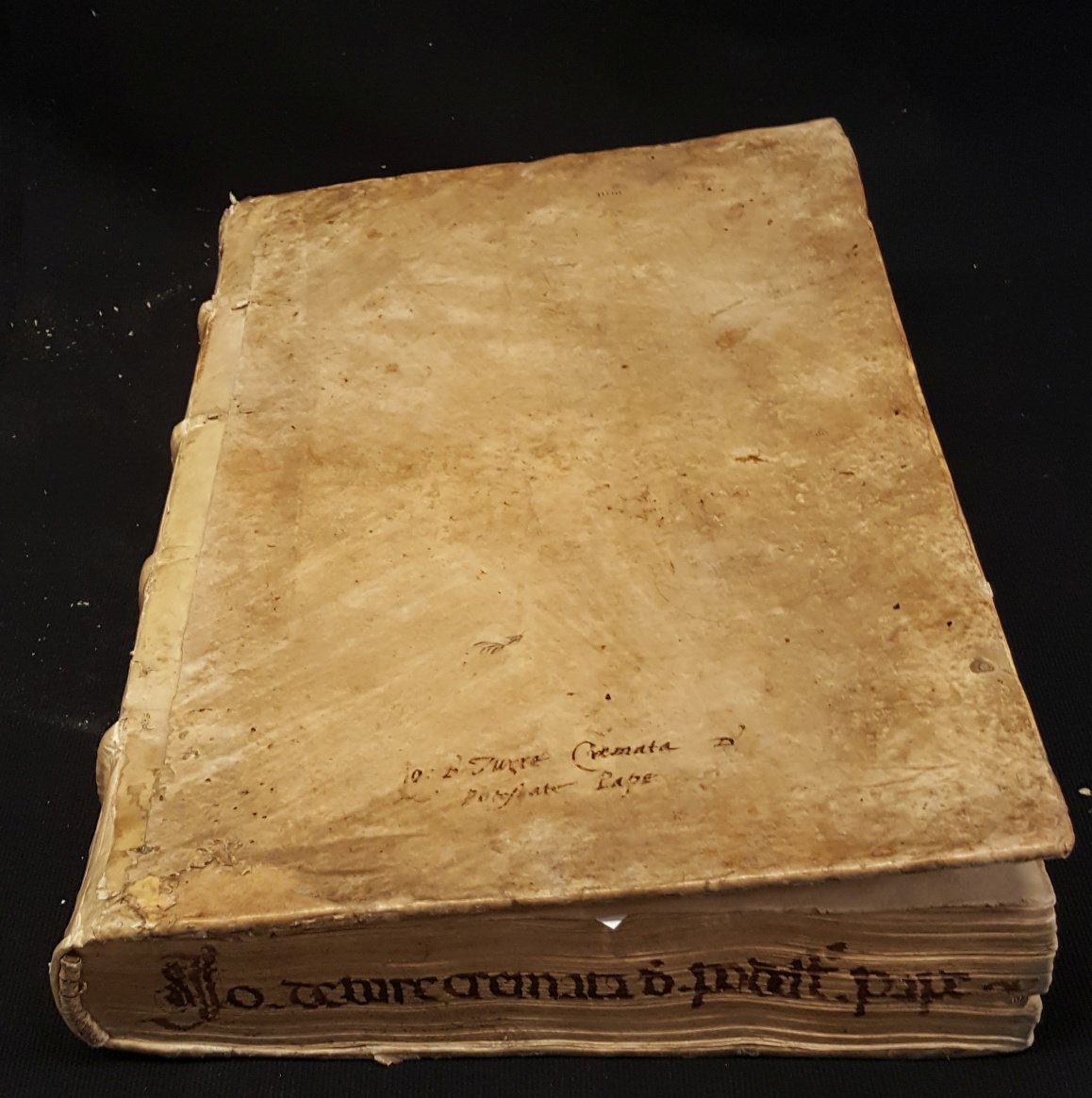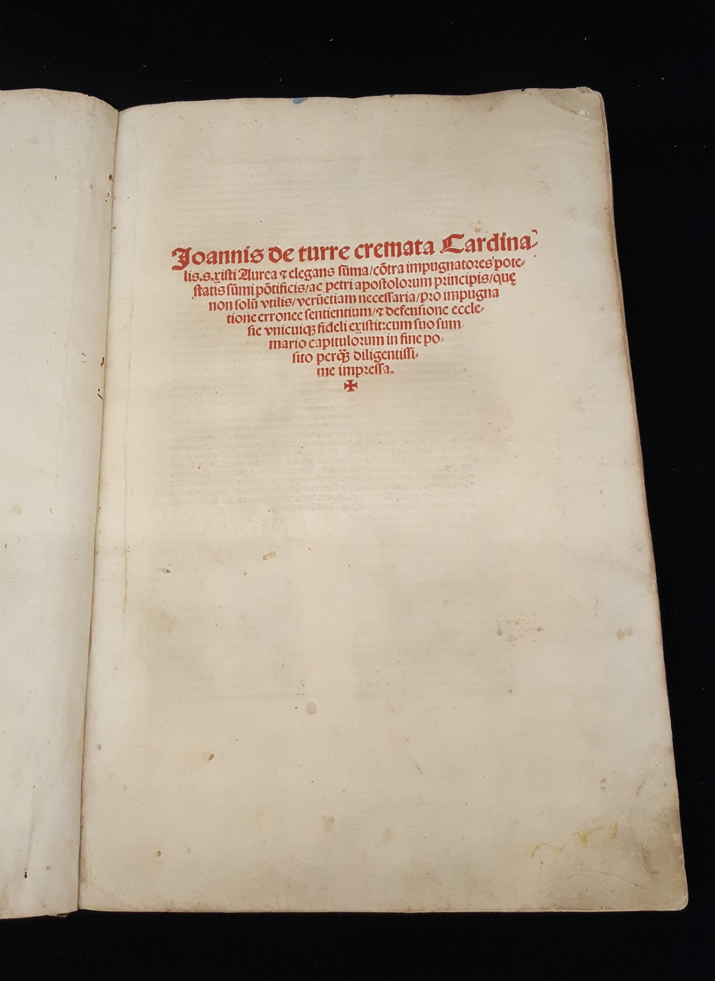 Esemplare con importante variante: il f. a1 reca al recto il titolo in grandi caratteri, impresso in rosso su 9 linee: “Joannis de Turre cremata Cardina/lis s.xisti Aurea & legans suma contra impugnatores pote/statis summi pontificis … diligentissi/me impressa”; al verso la prefazione dello Scoptius. Questo titolo fu impresso in pochissimi casi, ma su un foglio aggiunto e bianco al verso, e il foglio con la prefazione è bianco al recto. Risulta citato da Hain, in uno di quelli citati da Pellechet, e in 2 su 5 della Vaticana: infatti Hain è in 219 ff., e Pellechet in 220 ff., con il sesto bianco. Tutti gli altri esempl. (BMC, Polain, Oates, 2 Pellechet, 3 Vaticana, Choix d'Olschki) hanno 218 ff., senza il titolo e con il recto della prefazione bianco e i 4 ff. d'indice posti all'inizio; la nostra variante li deve invece avere alla fine, come chiaramente dichiarato sul titolo “cum suo summario capitulorum in fine po/sito”. Come nell'esempl. BMC, a fianco del registro si intravede l'impressione non inchiostrata della prima colonna dell'indice, che sarà poi in effetti stampata al verso del f. successivo. Entrambi gli esemplari della B.Nazionale di Firenze non hanno il titolo in rosso.