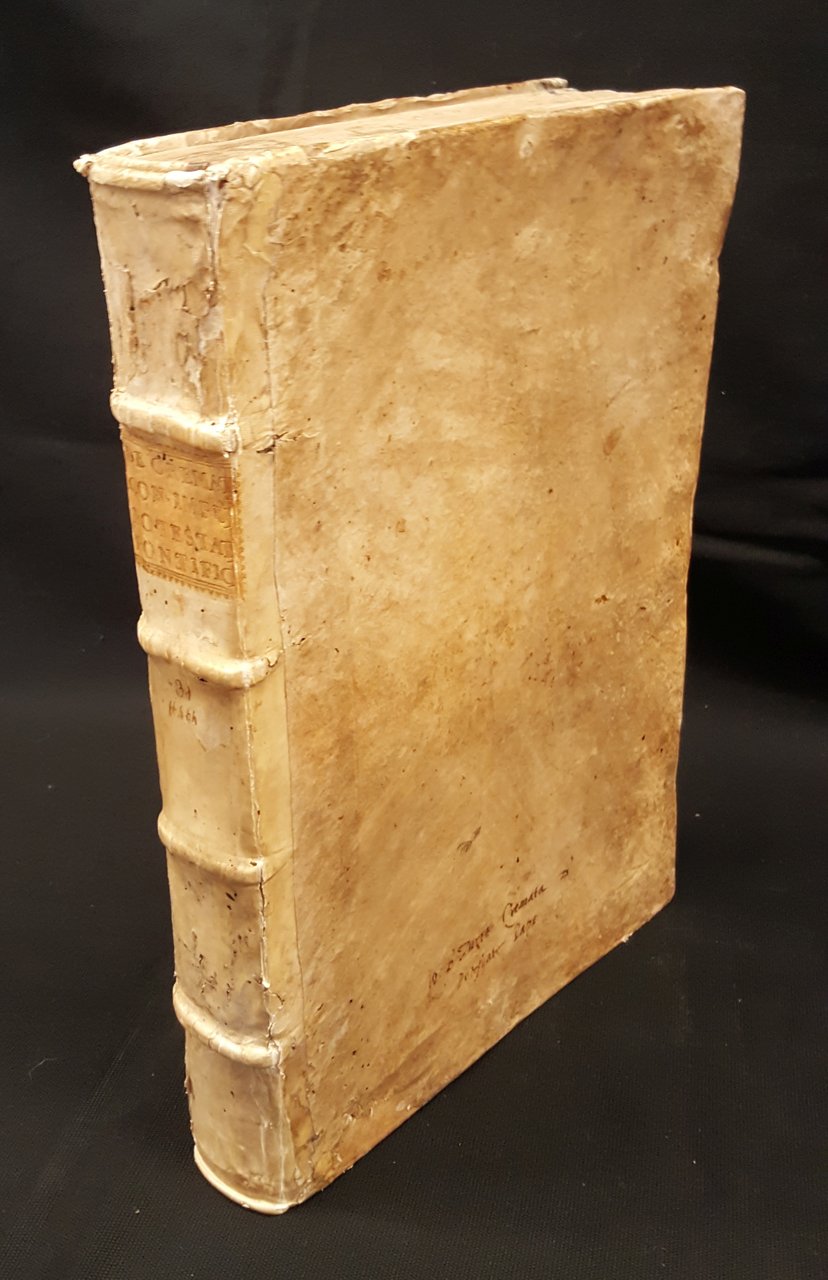 >in-folio (mm 405x274), ff. 218 (senza numeraz. né segnatura, ma: a-e8, f6, g-h8, i6, k-l8, m6, n-q8, r6, s8, t6, u-x-y8, z6, A-B8, C6, D8, E-F6, *4), legatura secentesca in pergamena, titolo ms. sul piatto ant. e sul taglio inf., il dorso restaurato nel XVII sec., con titolo in oro su tassello. Precede la lettera al lettore di Gerolamo Scoptius, in fine il registro e 4 ff. di Indici.