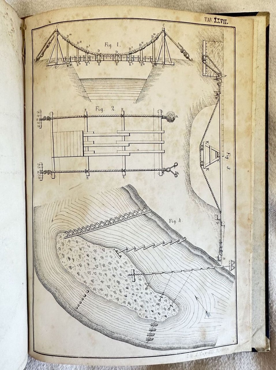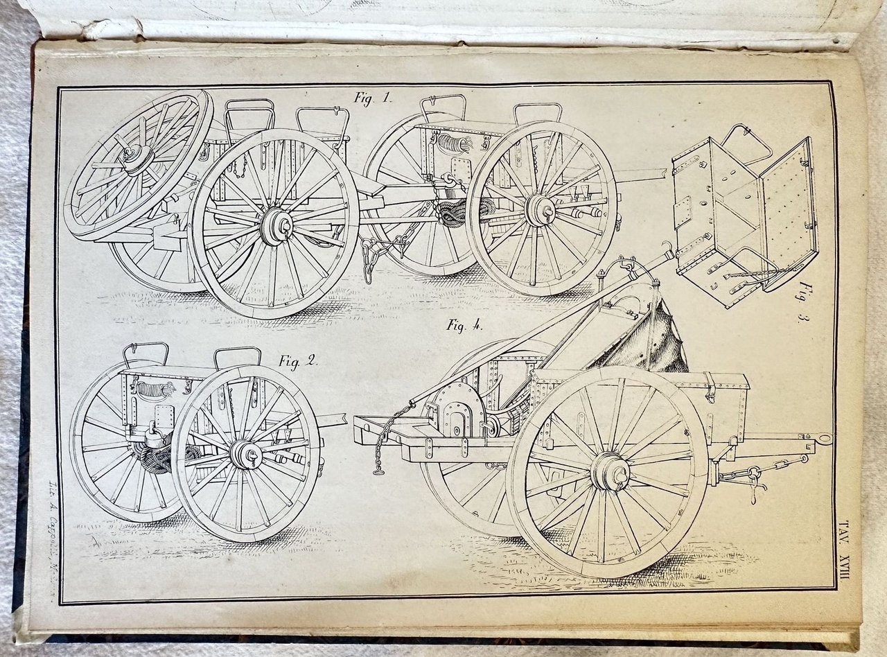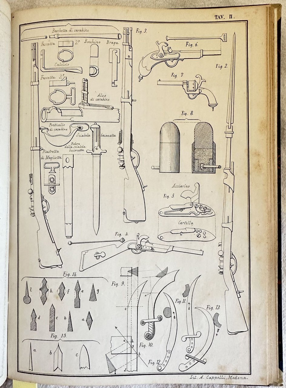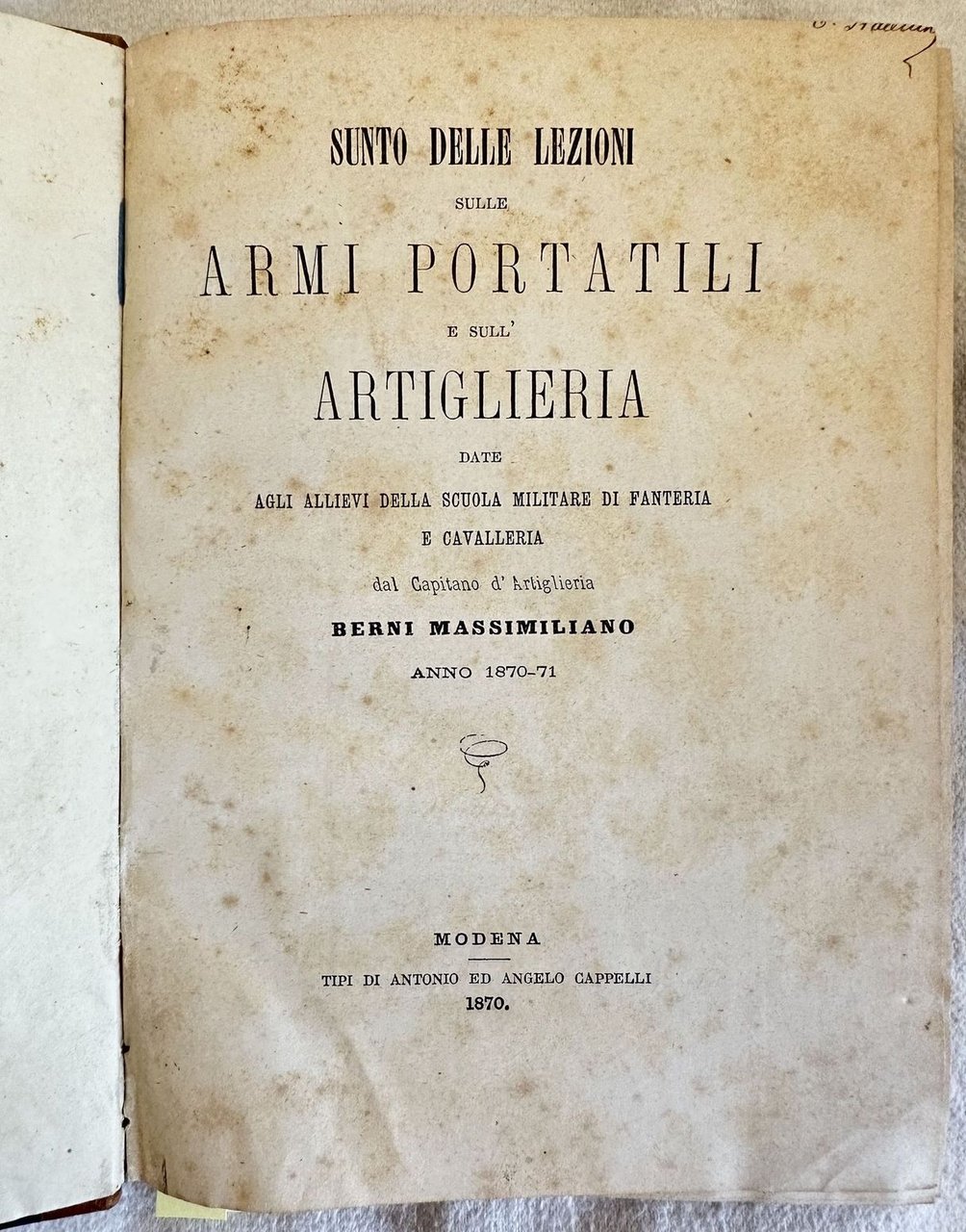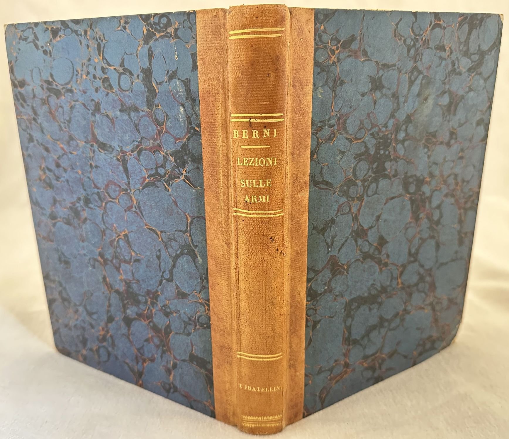 Edizione del 1870 delle lezioni sulle armi portatiti e artiglieria dettate dal Capitano d'Artiglieria Massimiliano Berni durante l'anno 1870-71 agli allievi della Scuola Militare di Fanteria e Cavalleria. All'interno: Nozioni sulle armi portatili d'ogni genere in uso presso l'esercito italiano, armi portatili da fuoco impiegate dalle varie nazioni, Teoria del tiro, Bocche da fuoco, cenni sul carreggio, Descrizione degli stabilimenti diversi d'artiglieria con indicazione della speciale fabbricazione, Fabbricazione della polvere e delle armi, Ordinamento e riparto dell'artiglieria nell'esercito italiano, Nozioni sul passaggio delle acque sulla costruzione dei ponti militari e sui materiali diversi a ciò impiegati ecc. Alla fine sono presenti 27 tavole fuori testo che mostrano armi e strumenti. In buone condizioni. Copertina in mezza pelle coeva con titolo e decorazioni in oro al dorso in buone condizioni generali con lievi usure ai margini e dorso. Legatura in buone condizioni. Pagine in buone condizioni con fioriture. In 8. Dim. 21x15,5 cm. Pp. 299+(5)+24+(1)+XXVII tav. Edition of 1870 of lessons of portable weapons and artillery told by the Captain of Artillery Massimiliano Berni during the year 1870-71 to the students of Military School of Infantry and Chevalry. At the end there are 27 plates of weapons and instruments. In good conditions. Half leather coeval cover with gilted title and decorations in the spine in good general conditions lightly worn in the extremities. Binding in good conditions. Inside pages are in good conditions with foxing. In 8. Dim. 21x15,5 cm. Pp. 299+(5)+24+(1)+XXVII tav.
