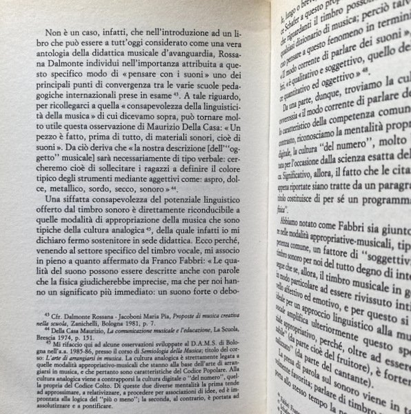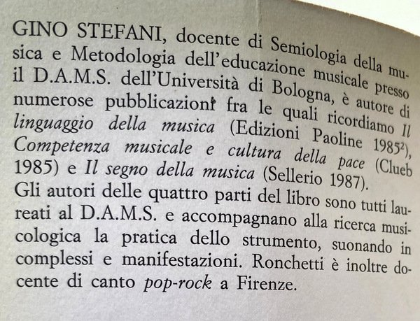Soggetti: Musica, Suonare, Musicologia, Metodologia, Strumenti musicali, Chitarra, Pianoforte, Conservatorio, Guide, Manuali, Tecniche, Suono, Linguaggio musicale, Note, Didattica, Insegnamento, Apprendimento, Scienze sociali, Cultura musicale, Competenza, Melodia, Semiotica, Educazione, Capire, Codici, Scala, Ritmo, Intervalli, Interpretazione, Cori, Coro, Armonia, Cappella, Classica, Rock, Comunicazione, Spettacolo, Arti performative, Musical instruments, Instruction and study, Social aspects, Instrumentalspiel, Segno, Giovani, Ragazzi, Lezioni, Corsi, Insegnanti, Voce, Pop, Canto, Cantare, Esercizi, Orecchio, Lettura, Musicalità, Chitarrista, Bande, Gruppi, Diploma, Professione, Percorsi, Scelta, Specializzazione, Canzone, Jazz, Real Book, Pedale, Notazione, Scuola, Vocalità, Musica classica, Contesti, Solfeggio, Repertorio, Mozart, Bach, Baglioni, Beethoven, Basso elettrico, Bassista, Esordio, Appropriazione, Scuole private, Dilettanti, Autoapprendimento, Fai-da-te, Autodidatta, Leggera, Agilità, Crisi, Corpo, Posizioni, Brani, Gamma, Patterns, DAMS, Bologna, Maurizio Della Casa, Creativa, Rossana Dalmonte, Codice popolare, Codice colto, Timbro vocale, Franco Fabbri, Metodo, Libri Vintage Fuori catalogo, Bibliografia, Riferimento, Consultazione, Progressi, Music, Play, Musicology, Methodology, Musical instruments, Guitar, Piano, Conservatory, Guides, Manuals, Techniques, Sound, Music language, Notes, Didactics, Teaching, Learning, Social sciences, Music culture, Expertise, Melody, Semiotics, Education, Understanding, Codes, Scale, Rhythm, Intervals, Interpretation, Choirs, Chorus, Harmony, Chapel, Classical, Communication, Show, Performing Arts, Sign, Young, Kids, Lessons, Courses, Teachers, Voice, Singing, Sing, Exercises, Ear, Reading, Musicality, Guitarist, Bands, Groups, Diploma, Profession, Paths, Choice, Specialization, Song, Notation, School, Vocality, Classical music, Contexts, Solfeggio, Repertoire, Electric bass, Bassist, Debut, Appropriation, Schools private, Amateurs, Self-study, Do-it-yourself, Self-taught, Light, Agility, Crisis, Body, Positions, Songs, Creative, Popular code, Cultured code, Voice stamp, Method, Out of print books, Bibliography, Consultation, Progress