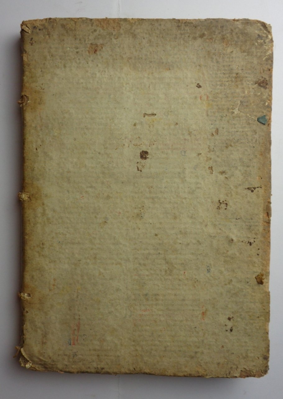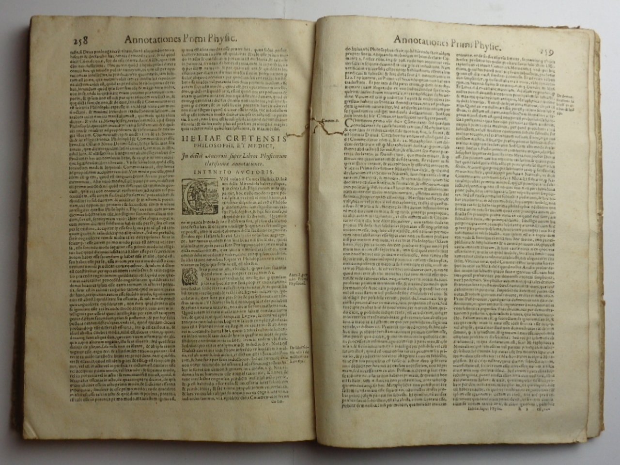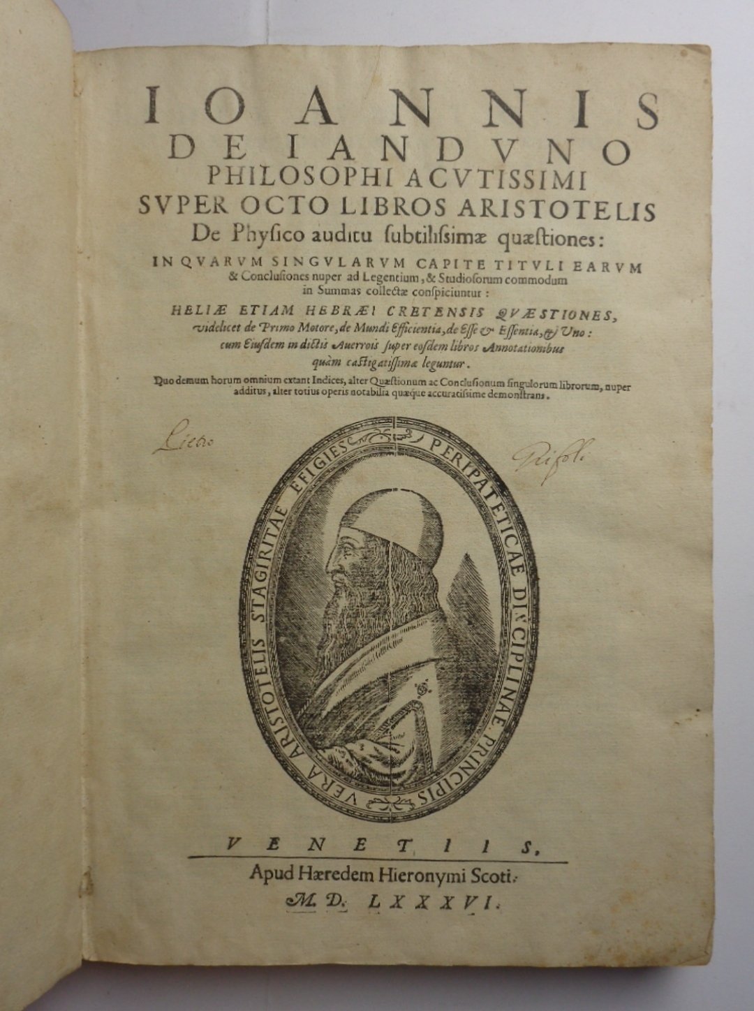 "...Heliae etiam hebraei Cretensis Quaestiones, videlicet de primo motore, de mundi efficentia, de esse & essentia, & vno: cum eiusdem in dictis Auerrois super eosdem libros annotationibus quàm castigatissimae leguntur. Duo demum horum omnium extant indices, alter quaestionum ac conclusionum singulorum librorum, nuper additus, alter totius operis notabilia quaeque accuratissime demonstrans". Un volume (22x32 cm) di (12-)290 pagine. Ritratto di Aristotele inciso alla pagina di titolo. Iniziali e fregi xilografici. Una antica firma al titolo (Pietro Grisoli). Ampi margini, carta senza fioriture. Colophon in fine. Piccola galleria di tarlo al margine interno bianco delle pp 128-149 e 249-272 (in un caso toccano una glossa), a un angolo (149-56) e al margine inferiore (173-205). Legatura coeva in cartonato con traccia di antico manoscritto a copertura, usure ai margini e ai nervi del dorso; tracce di antichi legacci. Bella edizione, assai ben impressa (al contrario di altre cinquecentesche). "Giovanni di Jandun (Jandun, 1280 – 1328) è stato teologo, scrittore, politico e filosofo Fu uno dei principali studiosi di Aristotele dell'epoca, amico e compagno di esilio di Marsilio da Padova con cui condivise idee e passione politica. Probabilmente collaborò con Marsilio nella stesura della prima parte del Defensor Pacis, ma per quanto vi si possa riscontrare analogia di pensiero non vi è certezza di una sua collaborazione materiale, da molti negata. Il suo pensiero è improntato alla esaltazione dell'uomo e alla primazia dell'Impero sulla Chiesa, di cui mise in discussione il potere temporale."