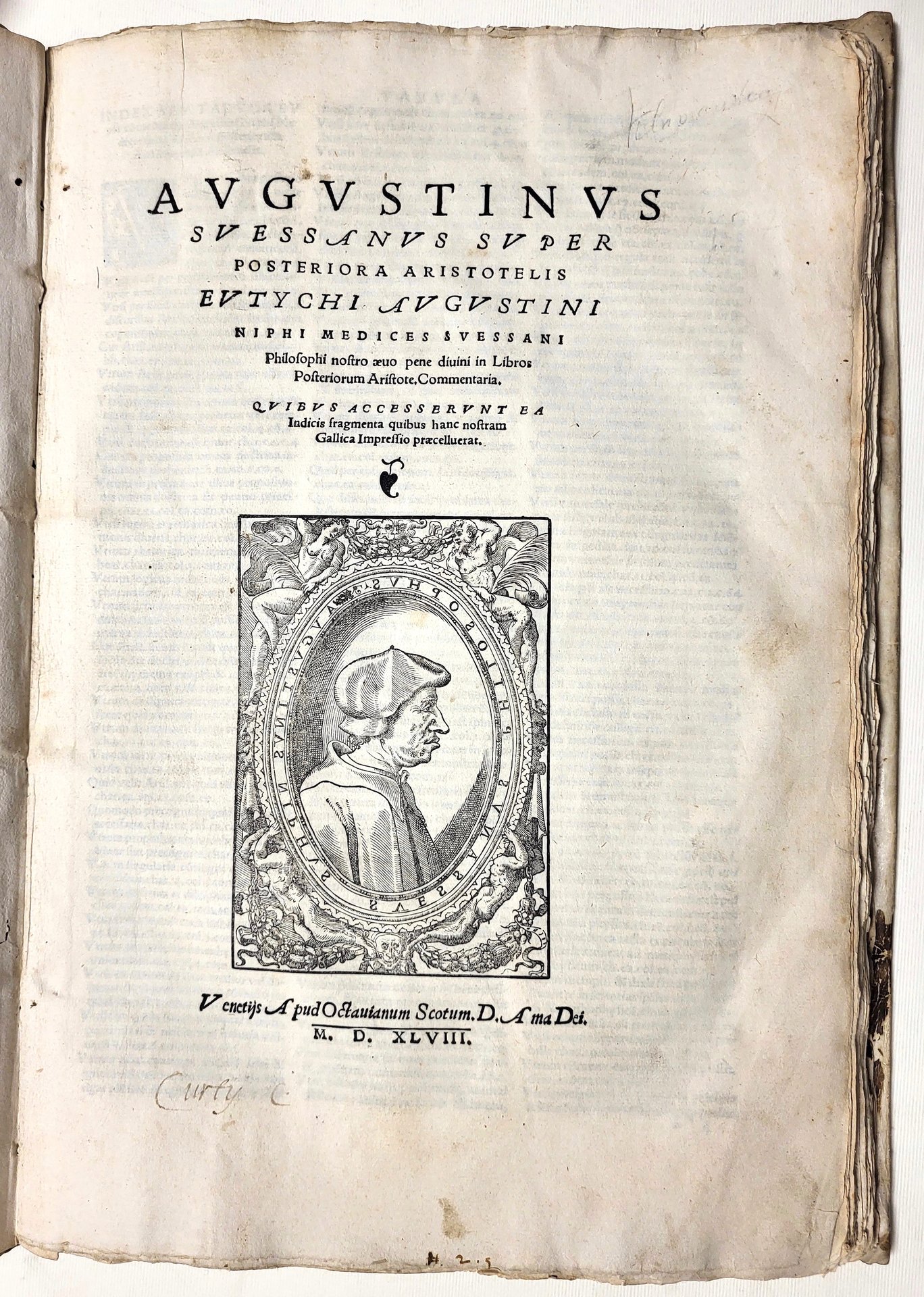 In Folio (330x220); carte 4 non num., 80. Vignetta con ritratto del Nifo al frontespizio, marca tipogr. Al verso dell'ultima carta, alcuni diagrammi nel testo. Capolettera parlanti in silografia. Testo su due colonne con note a stampa al margine. Pergamena molle antica rimontata, titolo manoscritto a inchiostro Bruno al piatto anteriore. <BR>Rara edizione di questo commento all'Analitica di Aristotele in due libri. Agostino Nifo, celebre studioso, cattedratico nelle più importanti università italiane, fu uno dei più importanti commentatori e traduttori di Aristotele. Nato a Sessa Aurunca (Caserta) nel 1469, inizia i suoi studi tra Sessa e Napoli per poi trasferirsi a Padova dove approfondisce gli studi filosofici su Aristotele e nel 1492 ottiene l'insegnamento di filosofia naturale. Nel 1495 è nominato professore ordinario e cura diverse opere su Aristotele. Dopo il suo trasferimento a Sessa nel 1499 si dedica allo studio del greco per poter comprendere le opere di Aristotele. Durante i suoi anni sessani e successivamente napoletani si dedica alla stesura di diverse opere. Tra il 1505 e il 1507 ha come studente Galeazzo Florimonte. Nel 1507 accetta la cattedra presso l'Università di Salerno per volere del principe Roberto II Sanseverino. Diverse sue opere sono in contrasto con quelle di Pomponazzi il quale dice, per capire il mondo c'è bisogno di un ordine razionale necessario, criticando anche la filosofia aristotelica la quale ha escluso l'intervento nelle cose di Dio e di altri poteri soprannaturali. Buon esemplare con barbe, macchia di inchiostro al margine est. della seconda parte del libro. Adams N-294. <BR>