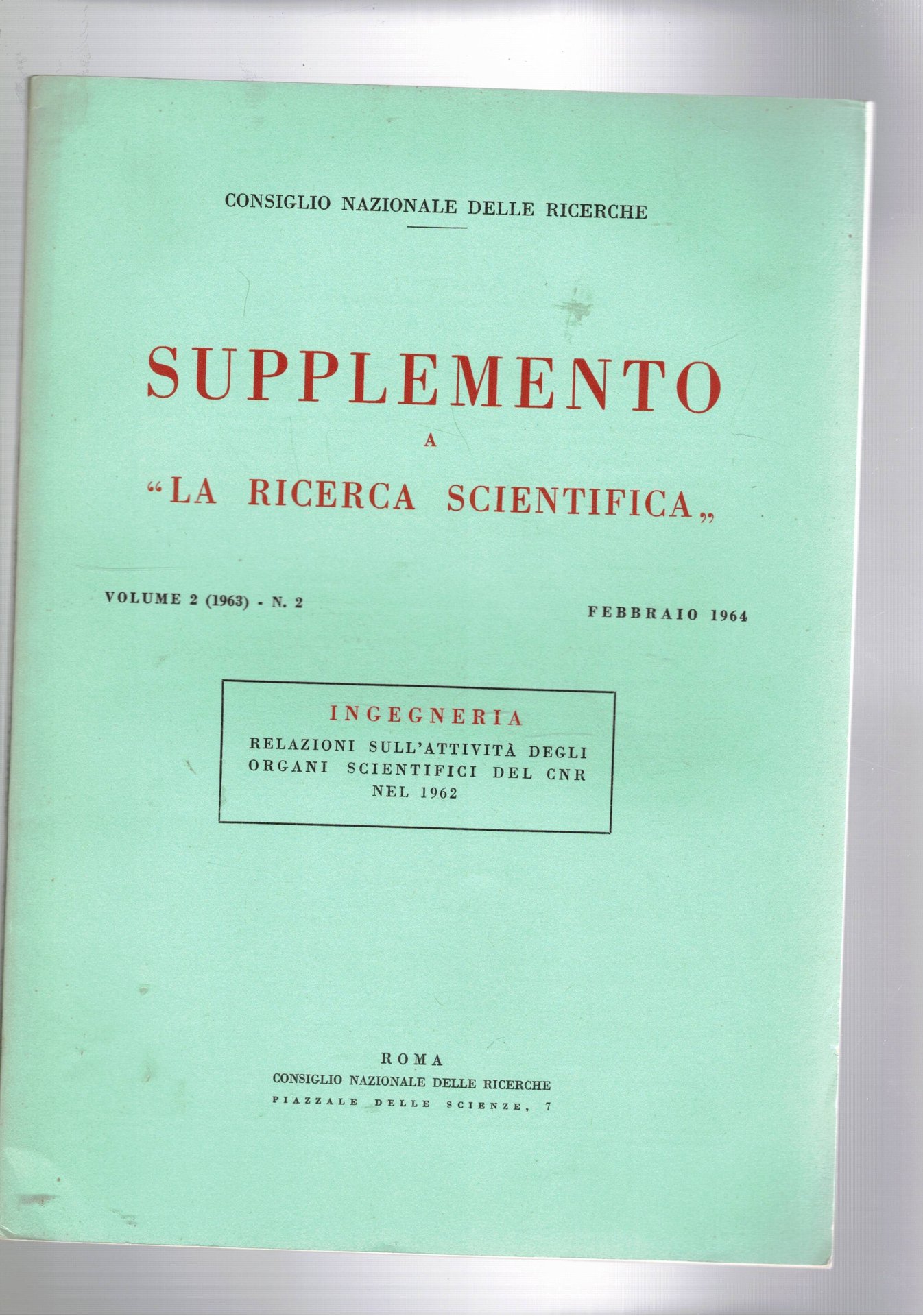 Supplemento a la ricerca scientifica vol. 2° n. 2 del 1964. Ingegneria. Relazione sull'attività degli organi scientifici del CNR nel 1962.