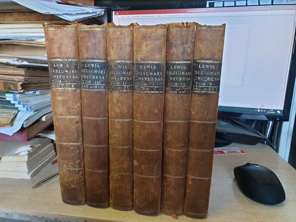 Tomi sei in-8° gr. cm. 27,5 di pp. VIII-368-358-370-400-311-312 con 102 tav. f.t. su 112 e con alcune tav. circa 10 con le ill. ritagliate con le forbici (da qualche bambino). Legature in mezza pelle con tass. ai dorsi e piatti in carta silografata. Testo sudue colonne.
