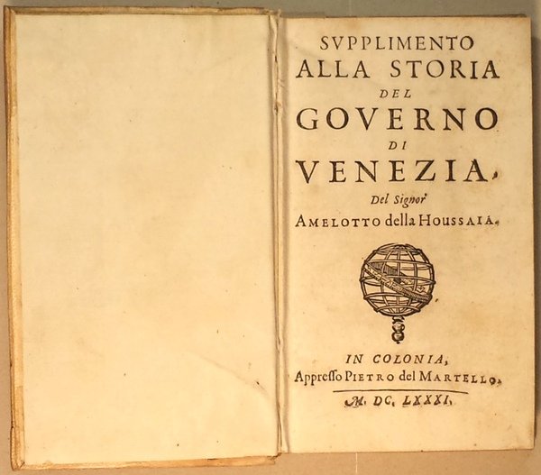 In-12 (14,2 cm) due voll. in uno 240 (4); (8) 242. Marca editoriale al frontespizio rappresentante Sfera armillare forse da attribuire al tipografo olandese Elzevier. Piena pergamena. Parenti, Falsi luoghi, p. 54: "Tutte queste edizioni hanno sul frontespizio la marca della Sfera, che dovrebbe farle attribuire alla tipografia olandese". Parte conclusiva dell'opera "La storia del governo di Venezia del signor Amelotto della Houssaia". Amelot de la Houssaye Abraham Nicolas (1634-1706)