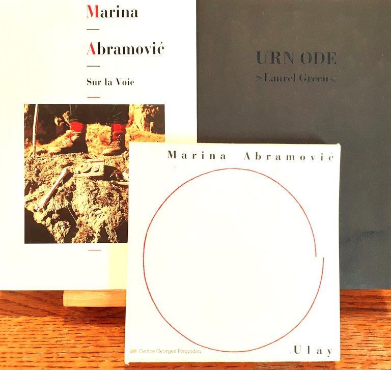 Catalogo dell'esposizione Abramovic/Ulay che si è tenuta presso il Musée national d'art moderne Centre Georges Pompidou di Parigi dal 6 giugno al 19 agosto 1990 composto da due volumi in brossura in-8 tenuti insieme da una fascetta editoriale in carta con grafica a tre colori. Testi in francese (altri autori: Jean-Hubert Martin, Paul Hervé Parsy, Bernard Marcadé, Davor Mati?evi? etc.). Volume Sur la Voie": pp. 128, illustrazioni in b/n e coll., copertina con illustrazione a coll. Volume "Urn Ode" / "Ode a l'urne": pp. 4 nn di rilegatura+64+2 nn di rilegatura, illustrazioni in b/n. Stato buono (il volume "Urn Ode" / "Ode a l'urne" è intonso)"