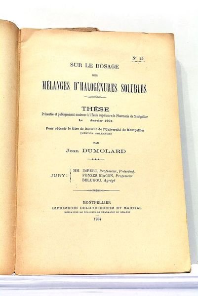 Sur le Dosage des Mélanges d'Halogénures Solubles. Thèse présentée et publiquement soutenue à l'Ecole supérieure de Pharmacie de Montpellier le janvier 1904.