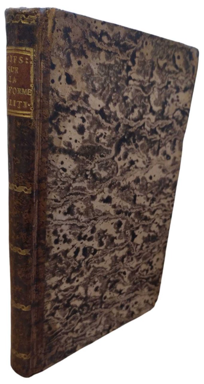 Prima rara edizione dell'opera di Honoré-Gabriel Riqueti de Mirabeau. Protagonista degli eventi politici della Francia rivoluzionaria, l'autore partendo dalla figura del filosofo Moses Mendelssohn affronta il tema degli ebrei, evidenziando le motivazioni per le quali questi avrebbero dovuto godere degli stessi diritti degli altri cittadini. in ottavo leg. m. pelle e piatti marmorizzati, titolo e decorazioni in oro al dorso pp. (68), 130 Buono (Good) Buon es..