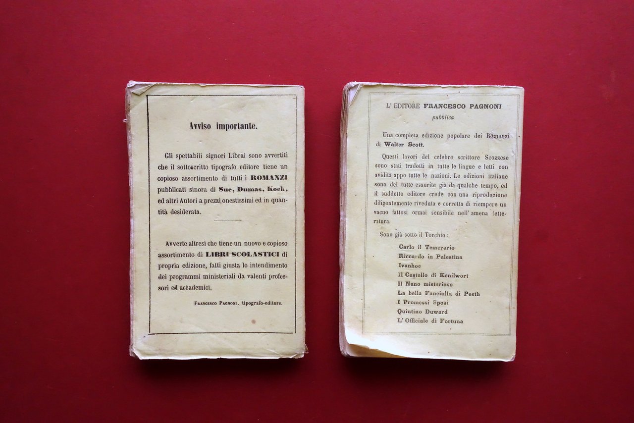 Kock, Susanna ovvero la mantenuta romanzo - 2 volumi opera completa Pagnoni, Milano, s.d. ma 1870 circa.; cm 15,5x10; pp. 174 (vol. 1); pp. 186 (vol. 2), entrambi con una ill. incisa in b/n all'antiporta. Brossura ed. d'attesa ill. in b/n. Opera completa in due volumi. Condizioni di conservazione Condizioni complessivamente buone con tracce d'uso e leggeri segni del tempo, brossure leggermente sgualcite con minime pieghette agli angoli e leggerissime tracce di sporco, volume 2 mancante della brossura anteriore (vedi foto); cuffie con minuscole mancanze. Interni buoni con alcune piccole leggere bruniture. Opera completa in due volumi. SETT172.L25662 N P