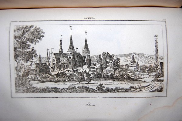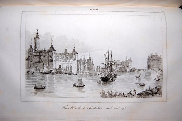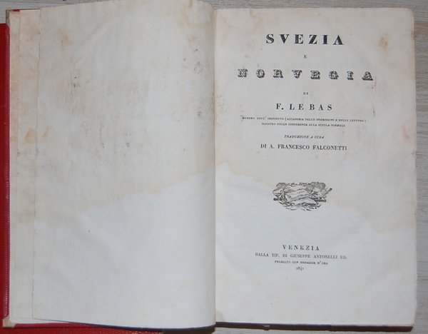 In 8° grande (23,4x14,4 cm); (4), 589, (3) pp. una c. di tav. fuori testo più volte ripiegata e 48 c. di tav. fuori testo con immagini di luoghi, costumi e personaggi. Bella legatura coeva in mezza pelle rossa con titoli e fregi in oro al dorso. Esemplare in barbe. Leggerissimo alone alle prime pagine del volume e per il resto completo ed in buone condizioni. L'opera uscì nella celebre collana di monografie a se stanti dedicata ognuna ad un paese del mondo pubblicata con il titolo "L'universo o storia e descrizione di tutti i popoli". Prima edizione italiana di questa celebre pubblicazione dedicata alla storia, cultura e geografia dei paesi scandinavi Svezia e Norvegia. Philippe Le Bas (18 giugno 1794, Parigi - 19 maggio 1860, Parigi) è stato un ellenista francese, archeologo e traduttore. Figlio di Philippe Le Bas, amico di Robespierre, e Elisabeth Duplay, la figlia del padrone di casa di Robespierre, Maurice Duplay. Aveva solo 6 settimane di vita quando suo padre si suicidò alla caduta di Robespierre il 27 luglio 1794. Prima edizione.