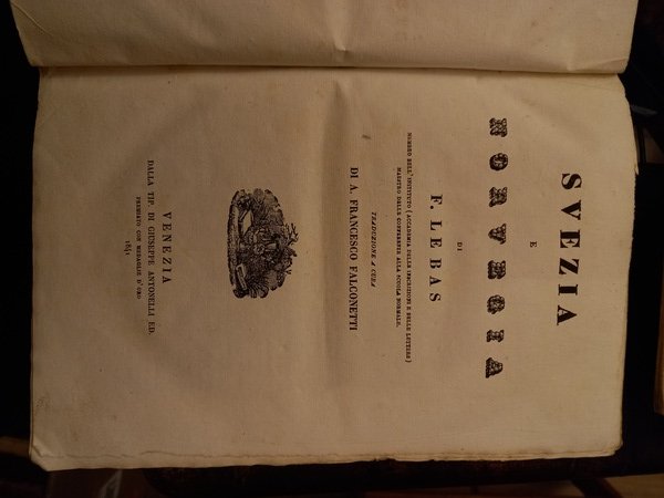 In-8 (23 cm) (4) 289 (1). Mezza pelle, fregi e caratteri dorati al dorso, piatti cartonati rivestiti di carta marmorizzata. Al Colophon: L'Universo o Storia e Descrizione di tutti i Popoli ec. Svezia e Norvegia. Le Bas Philippus (1794-1860): fu studioso di epigrafia greca, presidente dell’Istitute de France, responsabile della biblioteca della Sorbonne e precettore di Napoleone III. Esemplare senza tavole