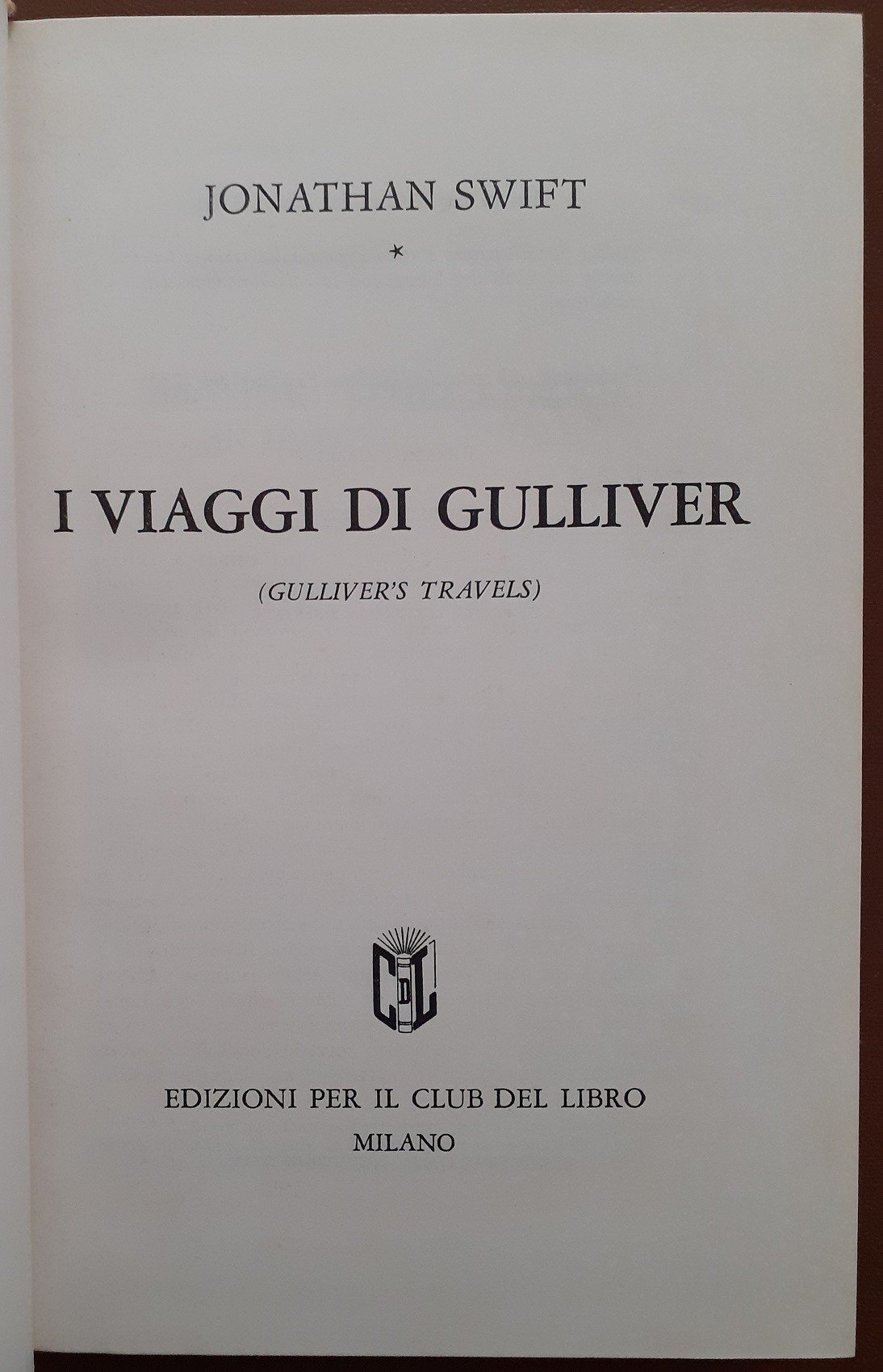 Jonathan Swift, I viaggi di Gulliver. Guliver’s travels, Edizioni per il Club del Libro, Milano 1964, pp. 431, cm 22, legatura in mezza similpelle ed. con titoli e fregi al dorso e piatti in carta marmorizzata. Collana dei grandi narratori, vol. 31. Esemplare n. A0092. Traduzione di Renato Ferrari. Prefazione di Charles Haines. Minime tracce d’uso alla legatura, lievissime fioriture ai tagli, per il resto ottimo esemplare.