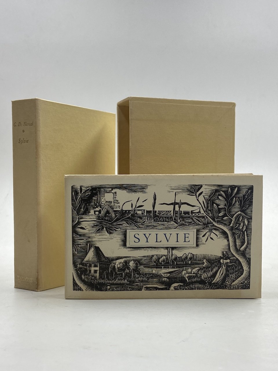 Brossura editoriale illustrata con camicia e custodia, 32mo oblungo cm 13x9, pp (12) XLIX (1) 107 (3), una xilografia all’antiporta di B. Melsonn (che firma anche l’illustrazione di copertina). Testo in francese, prefazione di Aristide Marie e avvertimento di Giselle Marie. Lievemente brunito il piatto posteriore della brossura, tracce di polvere su cofanetto e camicia editoriale.