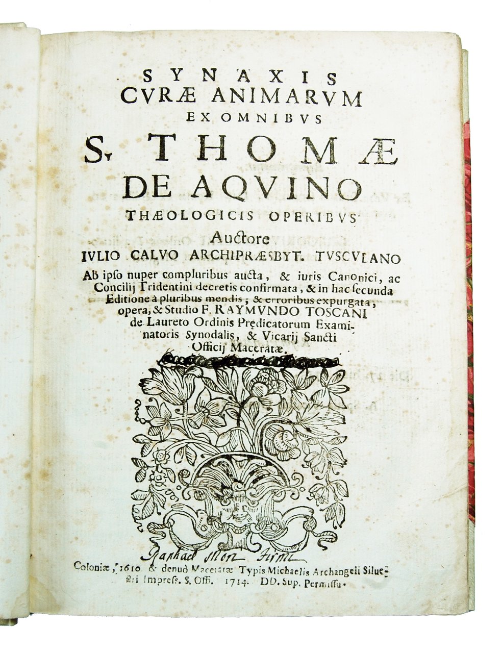 Synaxis curae animarum ex omnibus S. Thomae de Aquino theologicis operibus auctore Iulio Calvo Archipraesbyt. Tusculano ab ipso nuper compluribus aucta, et iuris canonici, ac Concilij Tridentini decretis confirmata, & […] Raymundo Toscani de Laureto Ordinis Predictorum […] Officij Maceratae.