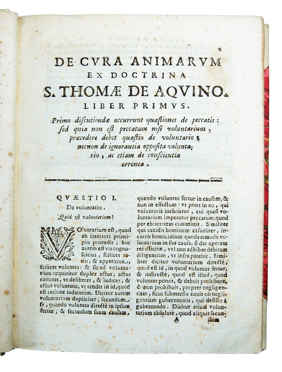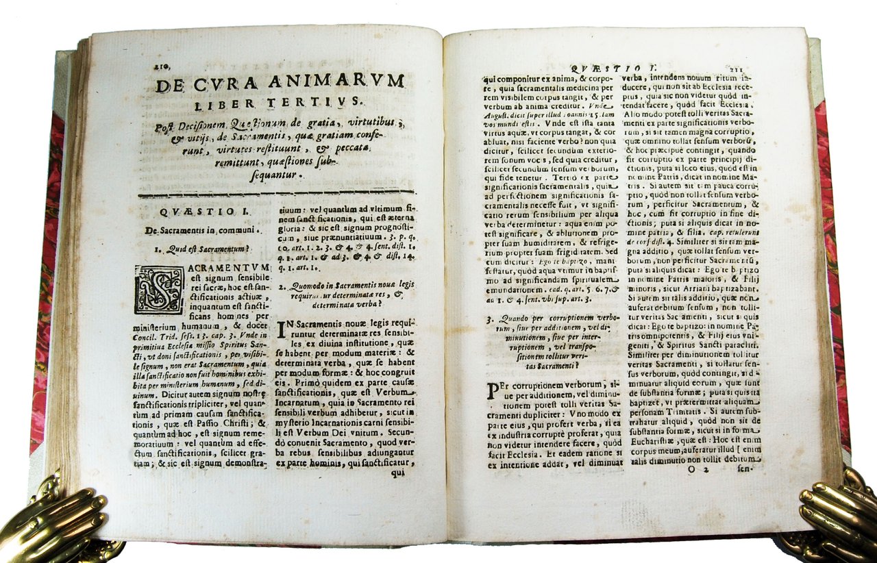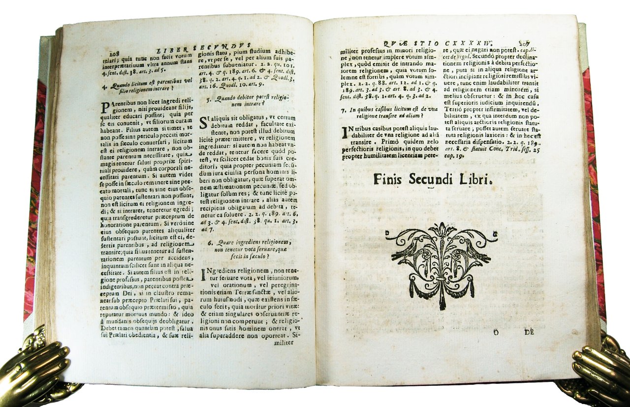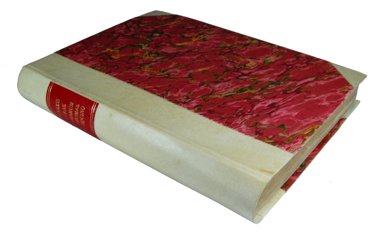 in-8° (228x170 mm); leg. moderna in mezza pergamena con angoli, dorso liscio, piatti in carta marmorizzata, titolo in caratteri dorati su tassello in pelle rossa al dorso; pp. (8), 360; incisione floreale al frontespizio, capilettera e finalini finemente incisi; il frontespizio è preceduto dall'occhietto con il titolo Synaxis Curae Animarum ex Doctrina S. Thomae de Aquino; testo stampato su due colonne. Opera di teologia morale, redatta a cura del sacerdote Giulio Calvi, sulla base della dottrina di San Tommaso, che, pubblicata a Roma nel 1600 e dedicata al cardinal Baronio, fu più volte ristampata, ed ebbe una certa notorietà nell'ambito della teologia; questa edizione è la ristampa fatta a Macerata dell'edizione di Colonia del 1610 dell'opera originale, con permesso di reimprimatur dato a Roma dal Palazzo Apostolico il 20 apr. 1713. Giulio Calvi (1554-1608) è stato un teologo, letterato e vescovo cattolico italiano. Tommaso d'Aquino (1225-1274) fu un frate domenicano, esponente della Scolastica, definito Doctor Angelicus dai suoi contemporanei. È venerato come santo sia dalla Chiesa cattolica, che dal 1567 lo considera anche dottore della Chiesa, sia dalla Chiesa luterana. Rif.: IT\ICCU\CFIE\018412 (12 copie). OCLC, 699766213 (only one copy outside of Italy, in the Nederlands at the Radboud Universiteit Nijmegen). Cond.: Leggera presenza di foxing e bruniture; opera completa, qusai in ottime condizioni generali. -- UNCOMMON TEXT OF MORAL THEOLOGY, WRITTEN BY THE PRIEST GIULIO CALVI, ON THE BASIS OF THE DOCTRINE OF ST. THOMAS. A REPRINT MADE IN MACERATA OF THE 1610 COLOGNE EDITION. Light presence of foxing and brownings; complete copy, in very good condition/quite fine.